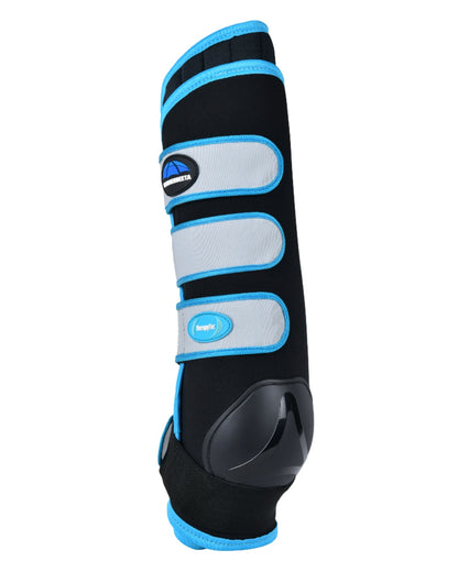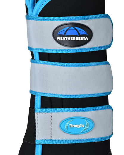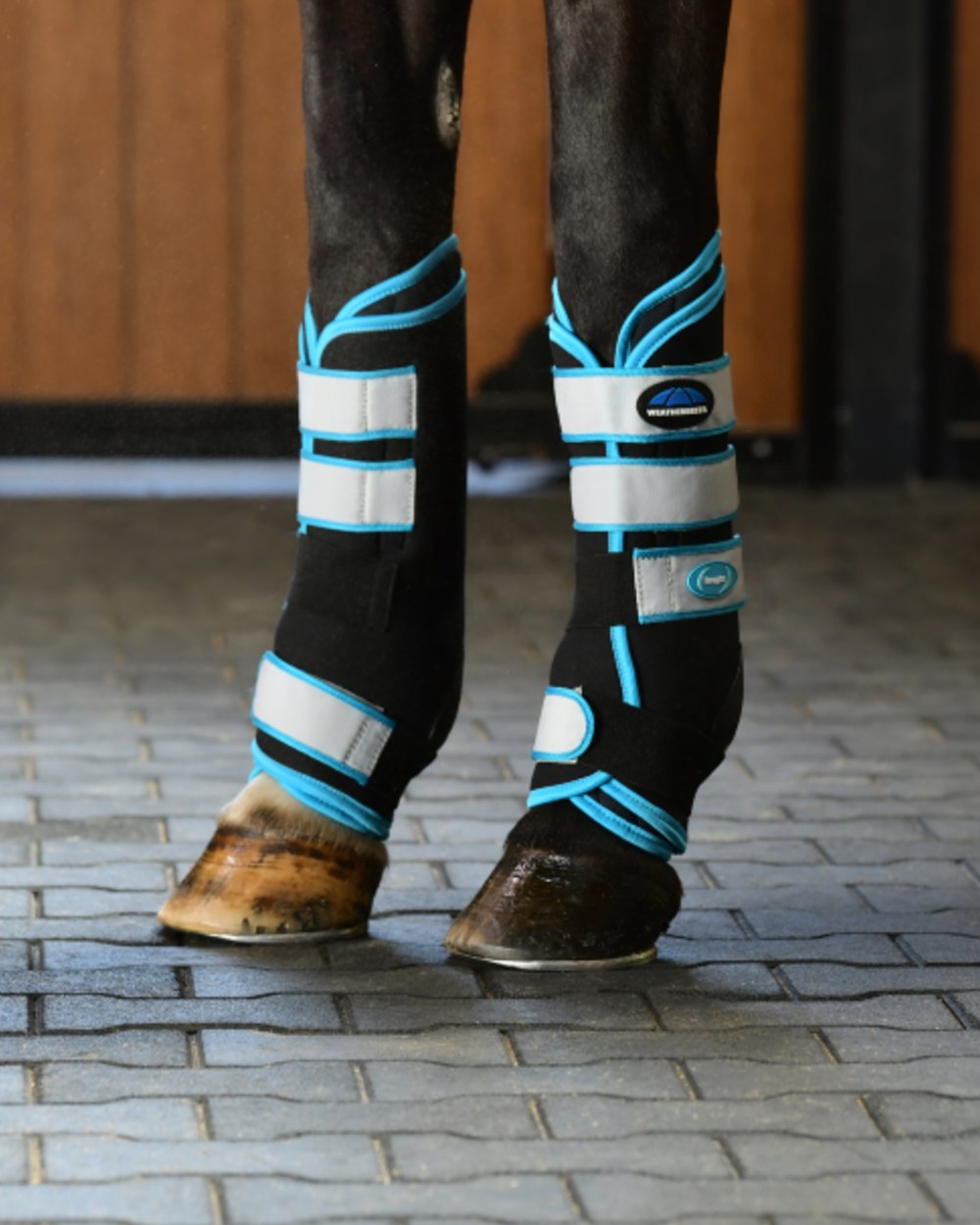 Black Blue Coloured WeatherBeeta Therapy-Tec Stable Boot Wraps on horse background