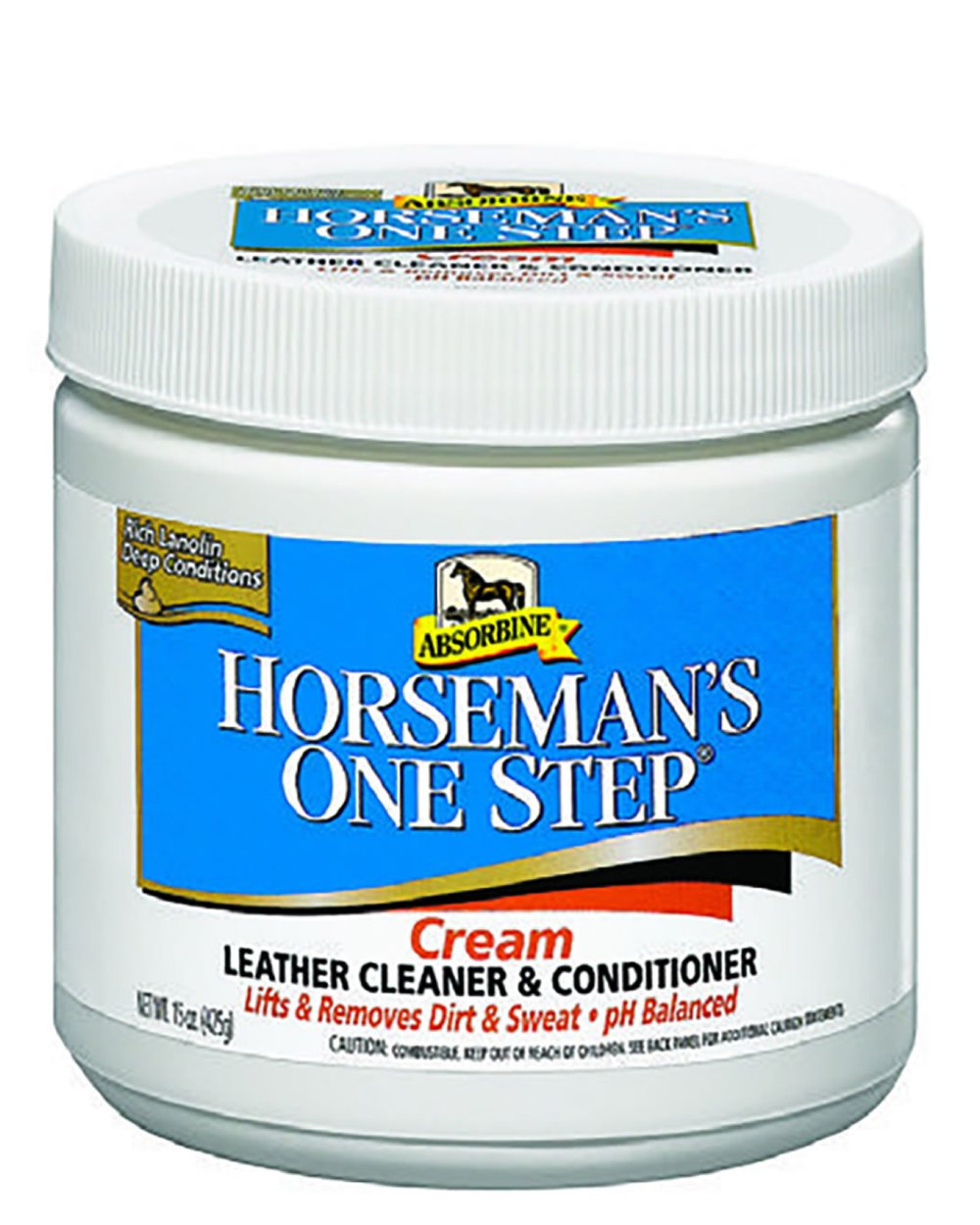 The Absorbine horsemans one step harness cleaner is a convenient one-step leather cleaning and conditioning cream. Three cleaning agents remove dirt, sweat and salt while helping to restore a natural shine. Designed for the busy equestrian, it requires no water and combines cleaning and conditioning in one step.