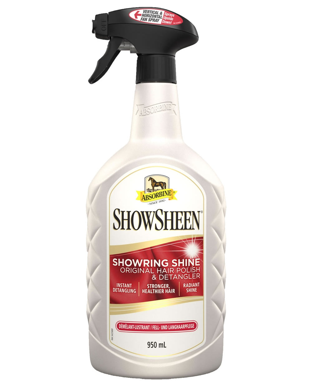 The Absorbine showsheen hair polish and detangler spray is with added pro-vitamins to nourish the coat and silk proteins to strengthen the mane and tail hair. This unique formulation provides the serious owner with an unsurpassed multi-purpose grooming aid. It coats each hair shaft to keep manes and tails tangle free, while its conditioning action reduces static, leaving the coat smooth and sleek. It repels dust, dirt and stains, keeping your horse cleaner for longer. Can reduce grooming time by as much as 80%.