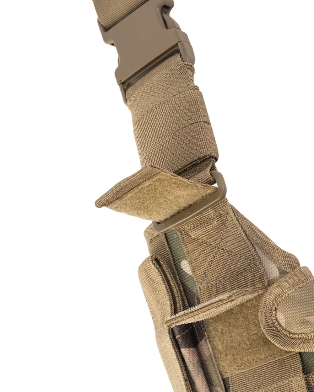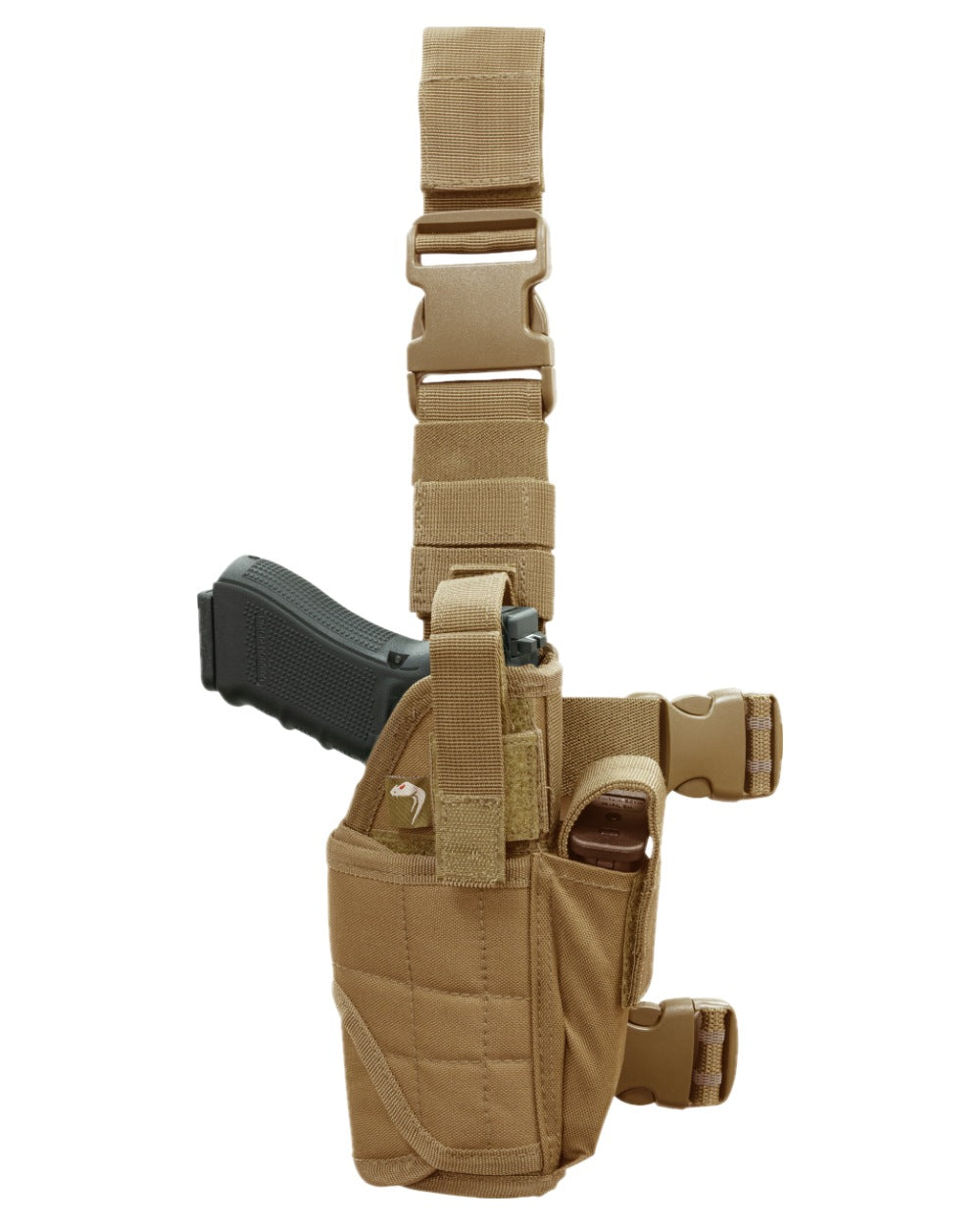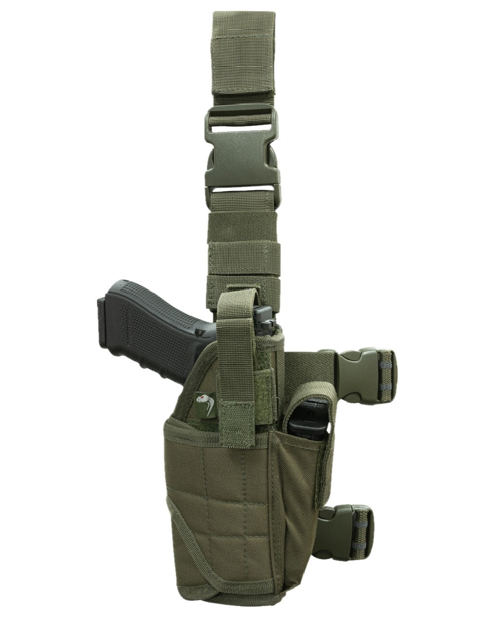 Using a leg holster to carry your sidearm is both practical and comfortable. The Viper Tactical Adjustable Holster is packed with features allowing you to fully customize it to your needs. Using hook and look adjustable straps on top and inside the holster you can adapt it to fit most of the popular pistol brands. The holster can be fitted using two adjustable wraparound leg straps and a belt strap with quick release buckle and hook and loop size adjustment. If needed the belt strap can be removed. On the front of the holster we added a pouch that can be used to carry one additional pistol magazine or small utilities including light sticks or a small torch. The pouch height can be adjusted using the removable hook and loop closure. The Viper Tactical Adjustable Holster is perfect for military enthusiasts, army and police forces as well as air soft and paintball players.