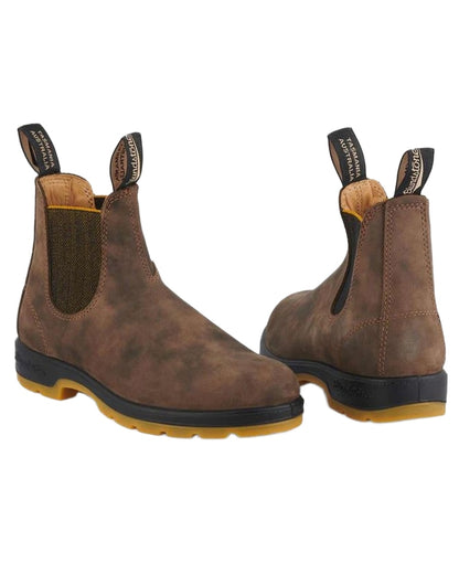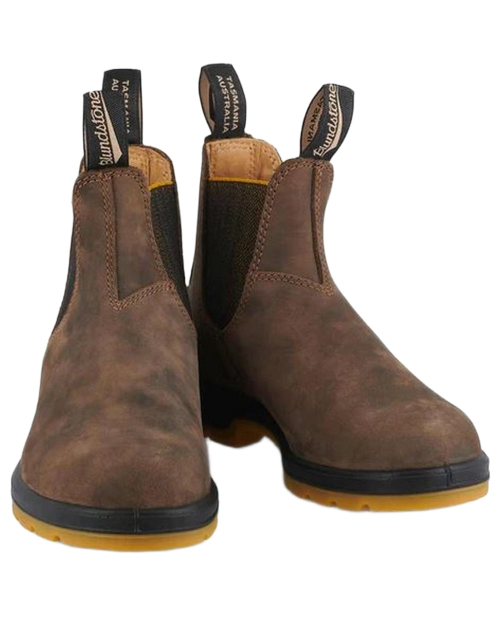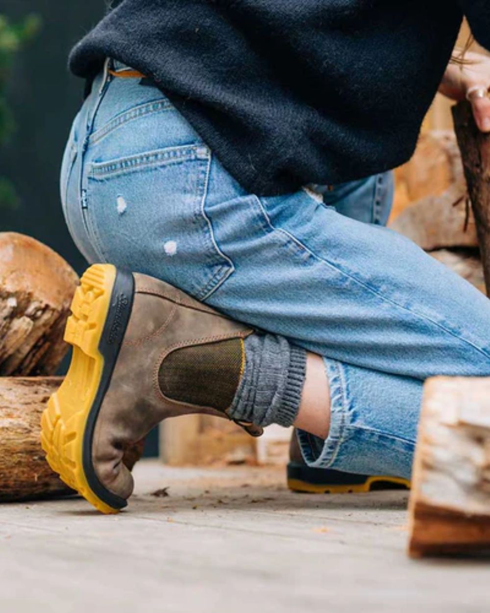 The Blundstone #1944 Rustic Brown leather boots add a distinctive mustard tone. Comprised of premium, water-resistant leather uppers paired with tweedy elastic and mustard TPU outsole for impact, stability and longevity. The polyurethane midsole supports while the contoured, removable and replaceable footbeds provide extra cushioning comfort.