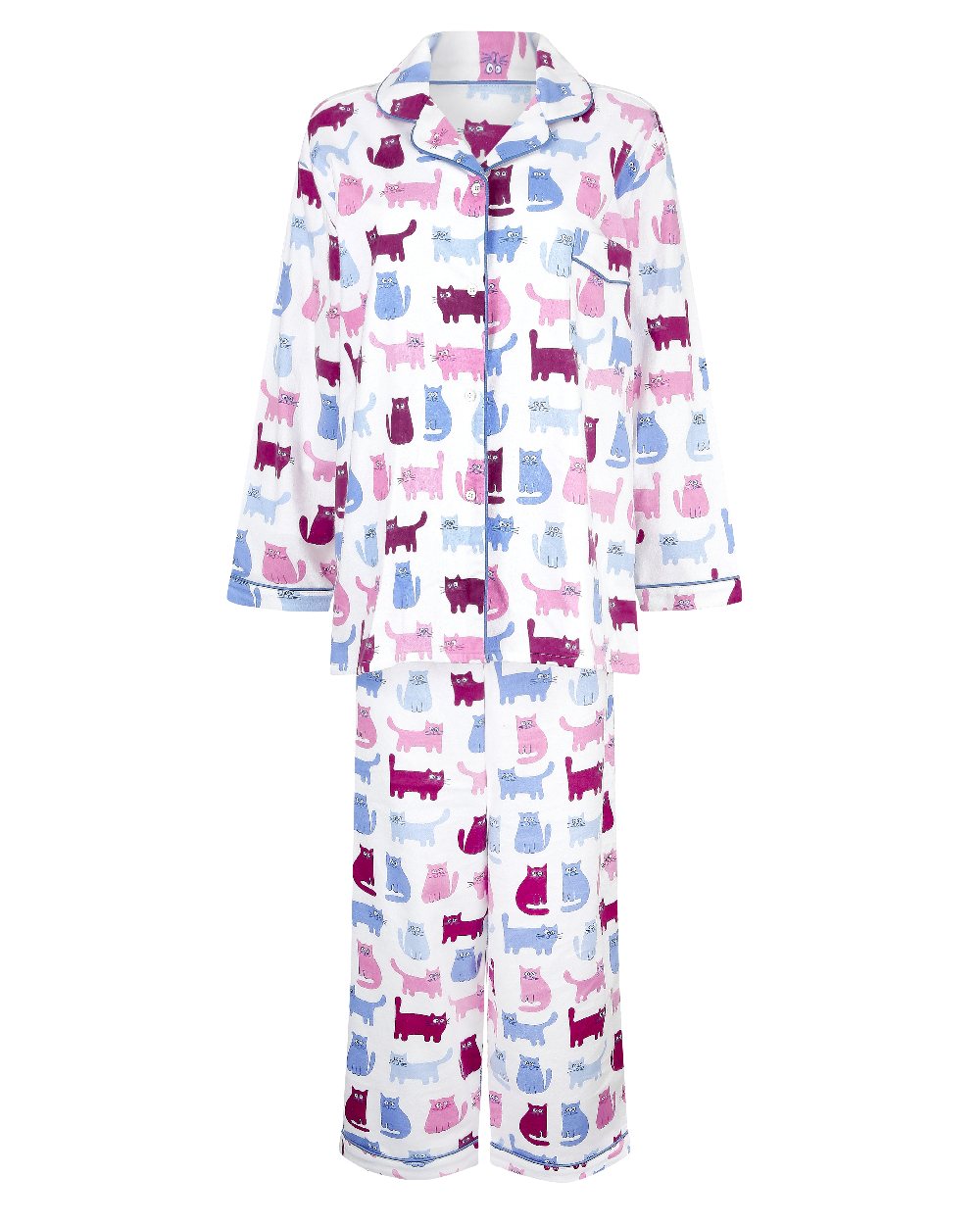 The Champion Paris Women's Cat Pyjamas are made from 100% brushed cotton. This makes the pyjamas cosy but also breathable, they are ideal for people who get hot through the night as the cotton composition allows for moisture to be wicked away from the skin.