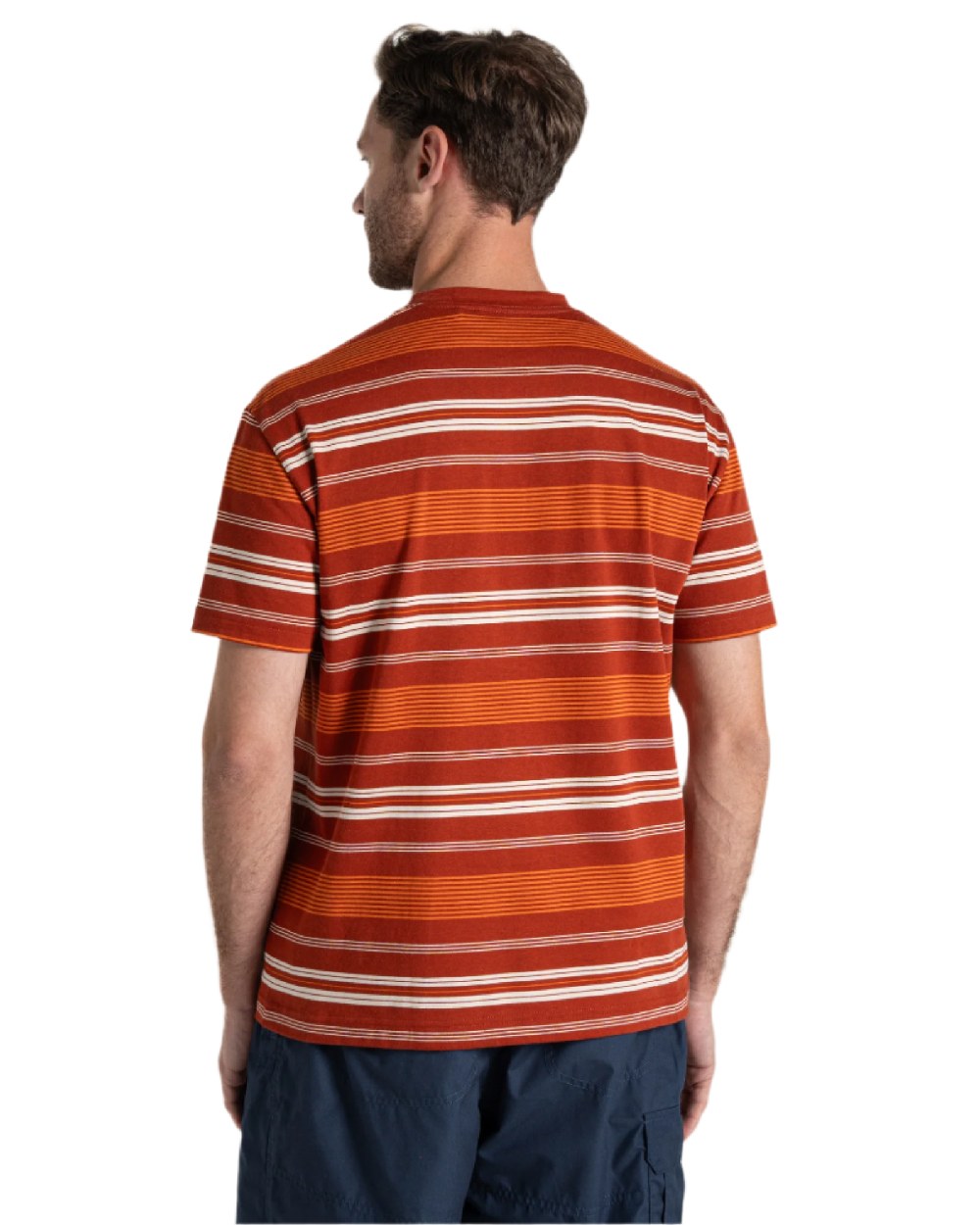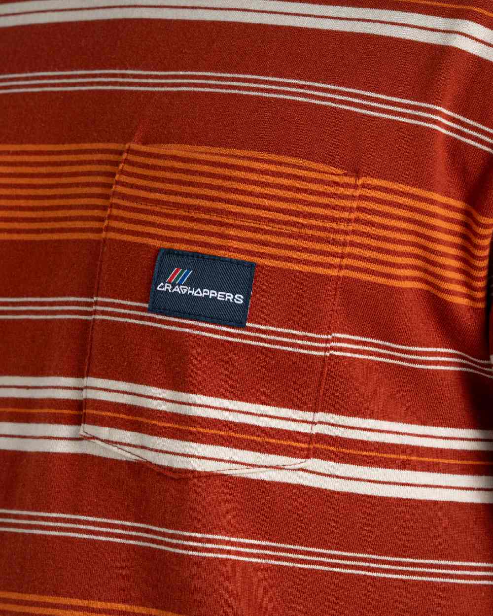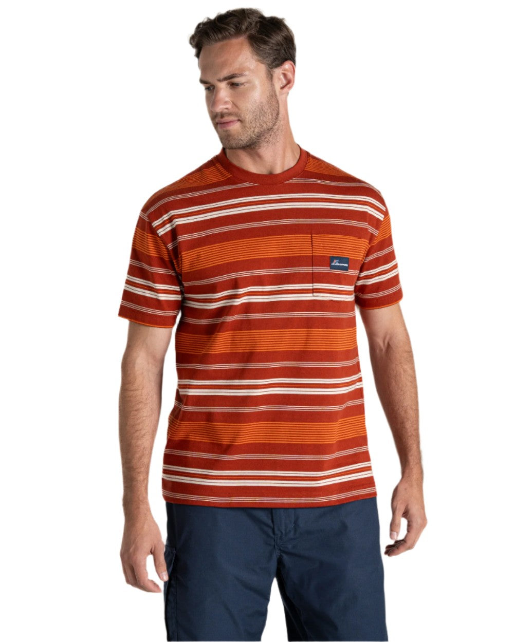 The Craghoppers Men's Pointer Short-Sleeved T-Shirt features a bold striped design crafted from supersoft 100% organic cotton jersey. This expert-quality tee includes a convenient chest pocket for added functionality.