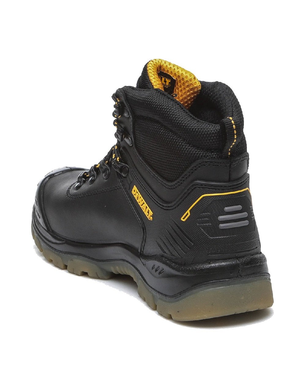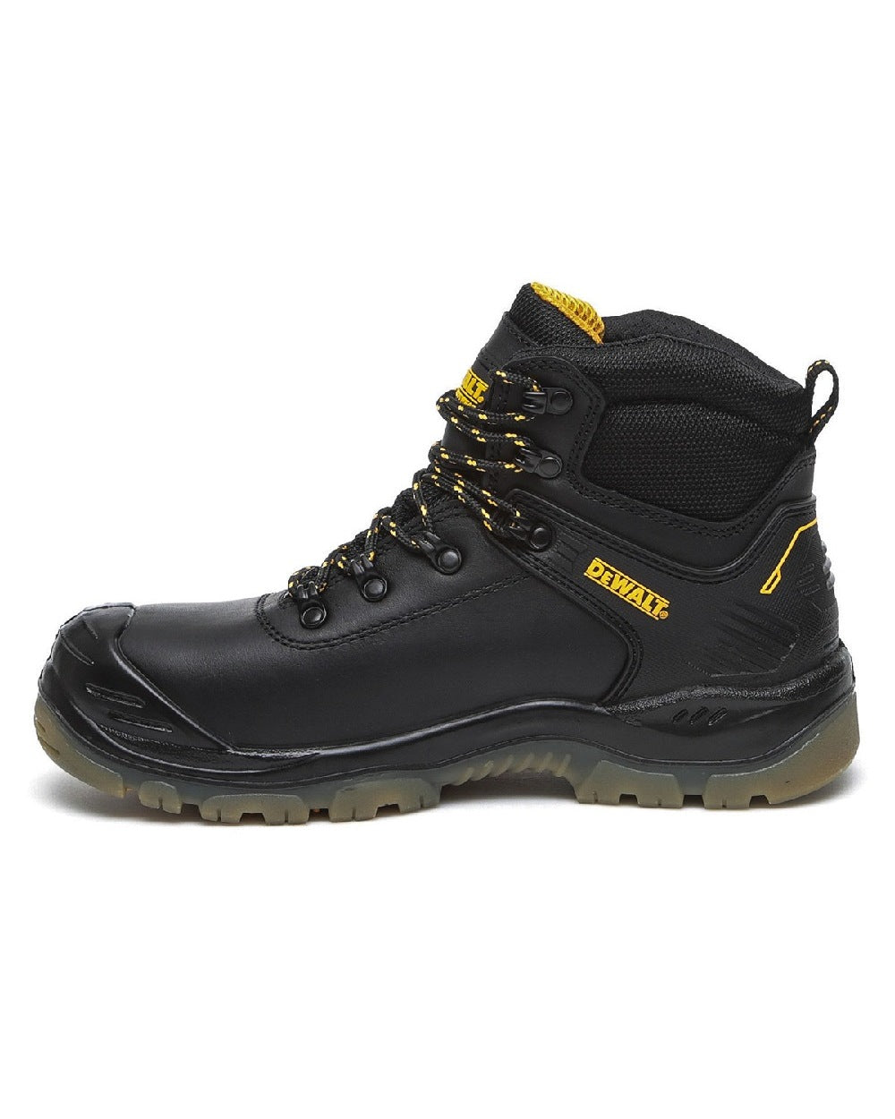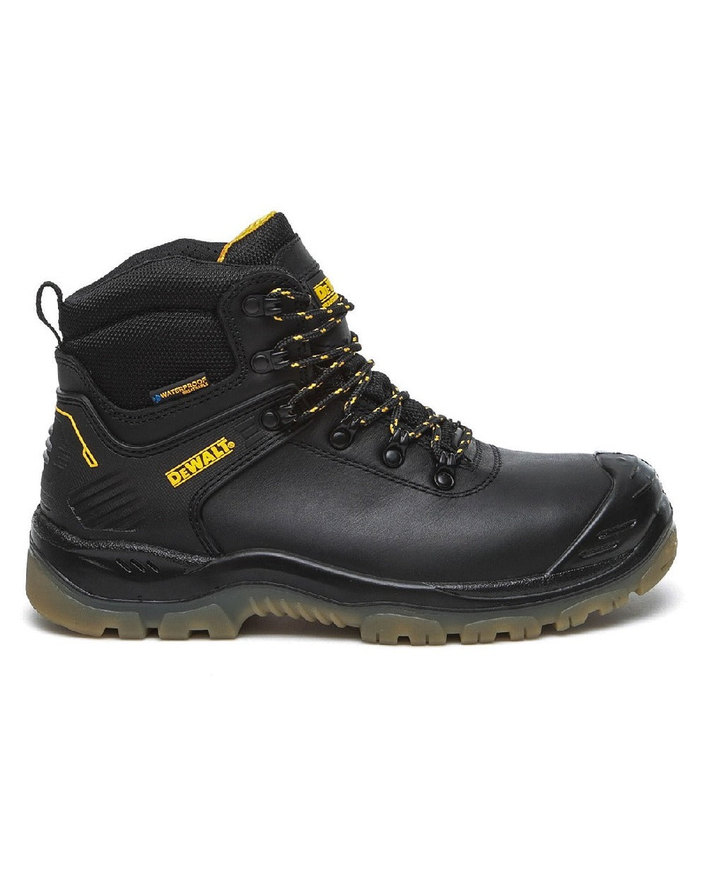 Full grain black leather upper. Waterproof and breathable membrane inner lining. Padded tongue and collar for added comfort. Steel toe cap and steel midsole protection. PU comfort insole. TPU dual density outsole. Anti-scuff toe guard. TPU heel support system. A high quality waterproof safety boot from DeWalt.
