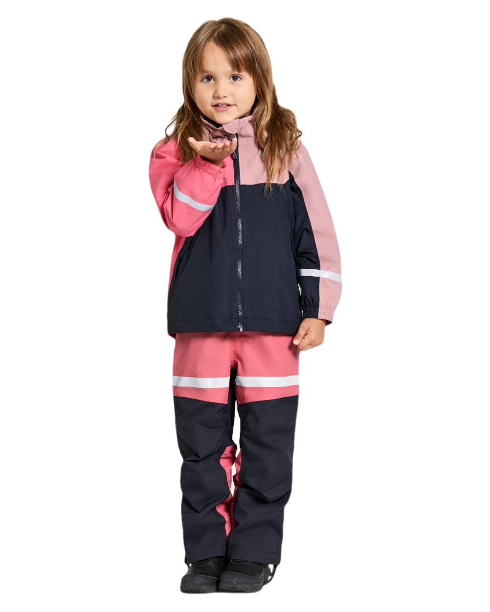 It has a removable and adjustable hood with elastic sides for optimal fit. The cuffs are elasticated and equipped with safety loops for mittens, keeping them in place. The jacket also has a practical front zip closure and side pockets with Velcro.
