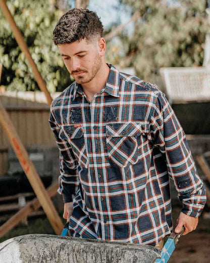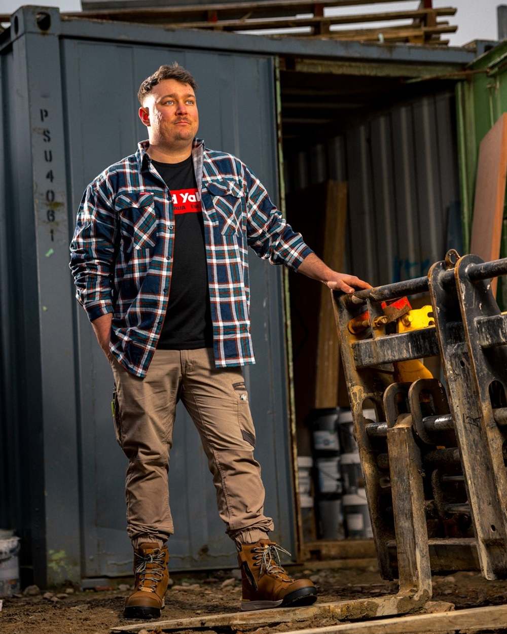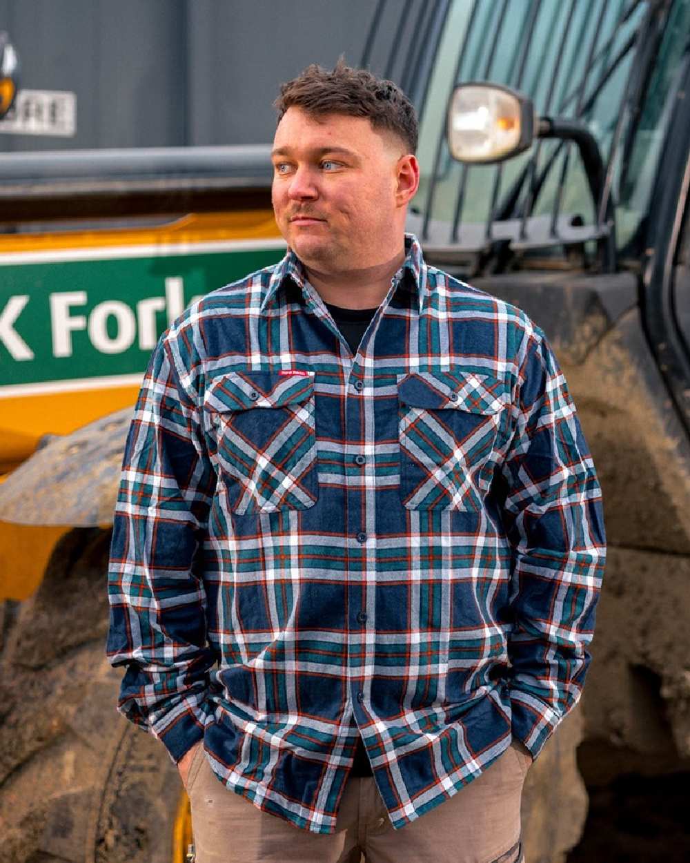 Navy Coloured Hard Yakka Mens Lightweight Check Flannel Shirt on Construction Background