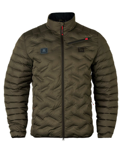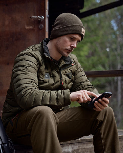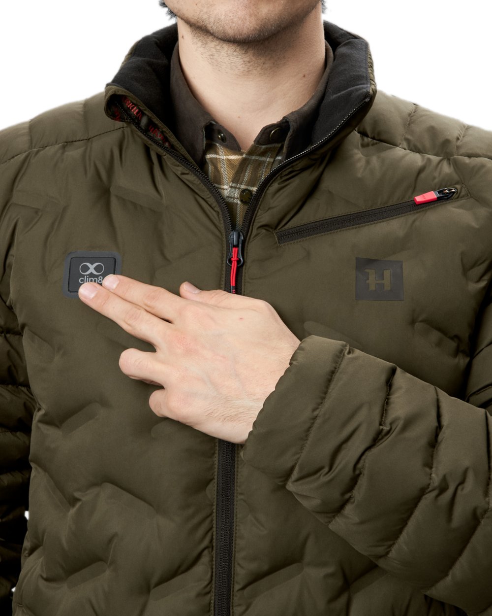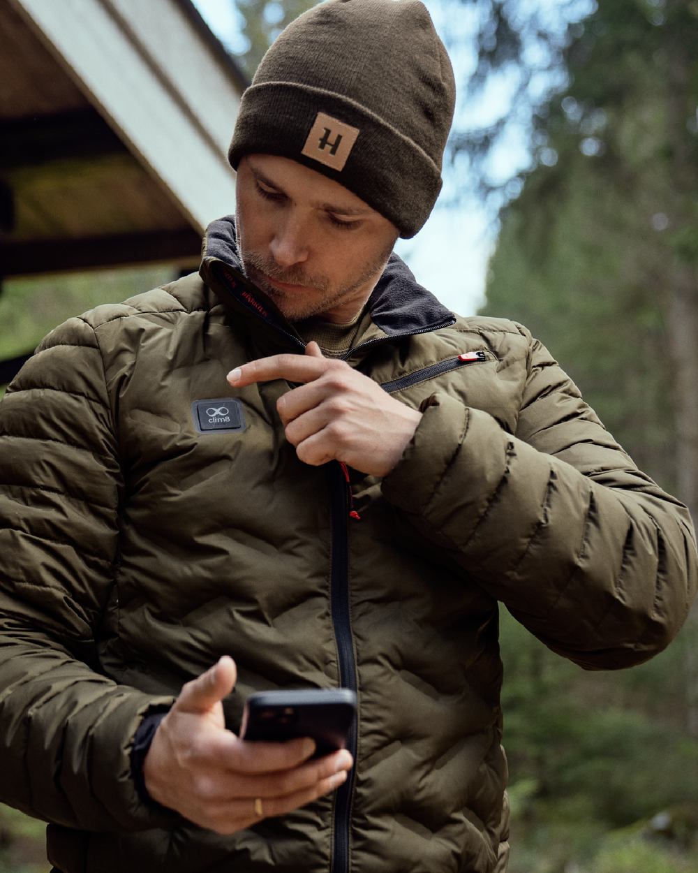 The Härkila clim8 insulated jacket is an intelligent self-regulating heating jacket that can be controlled directly on the jacket itself by tapping the clim8® logo or fine-tuned by using the clim8® app. The jacket has down insulation, a wind-resistant lining, and a heat-reflecting liner that directs the heat back toward the body. The jacket is powered by a power bank through a USB connector.