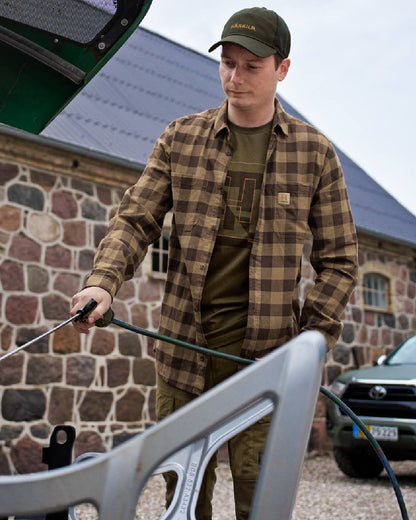 Antique Bronze Check Coloured Harkila Scandinavian Long Sleeve Shirt on countryside background