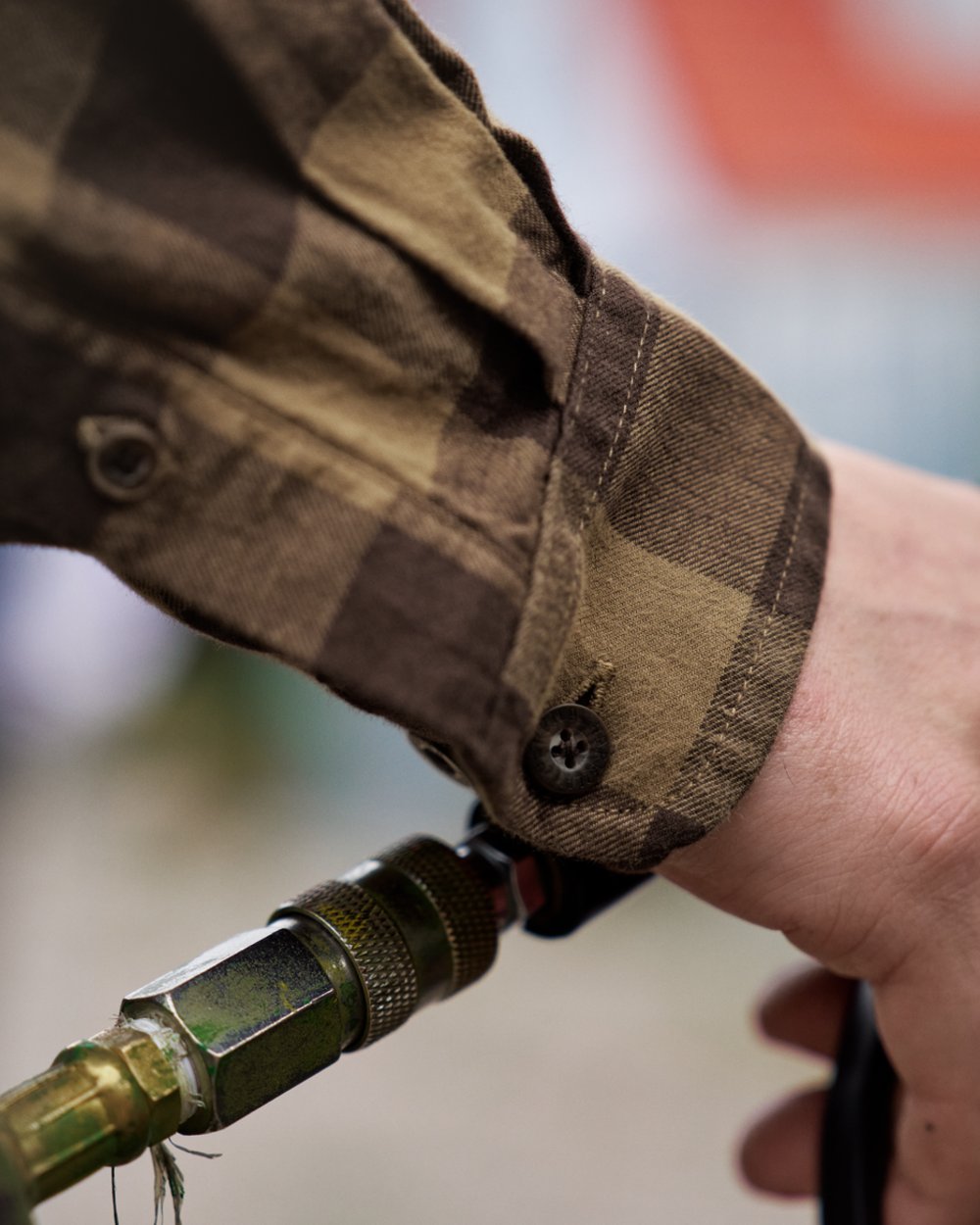 Antique Bronze Check Coloured Harkila Scandinavian Long Sleeve Shirt on blurry background