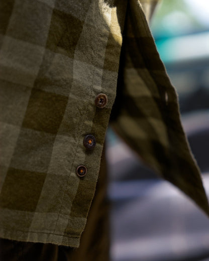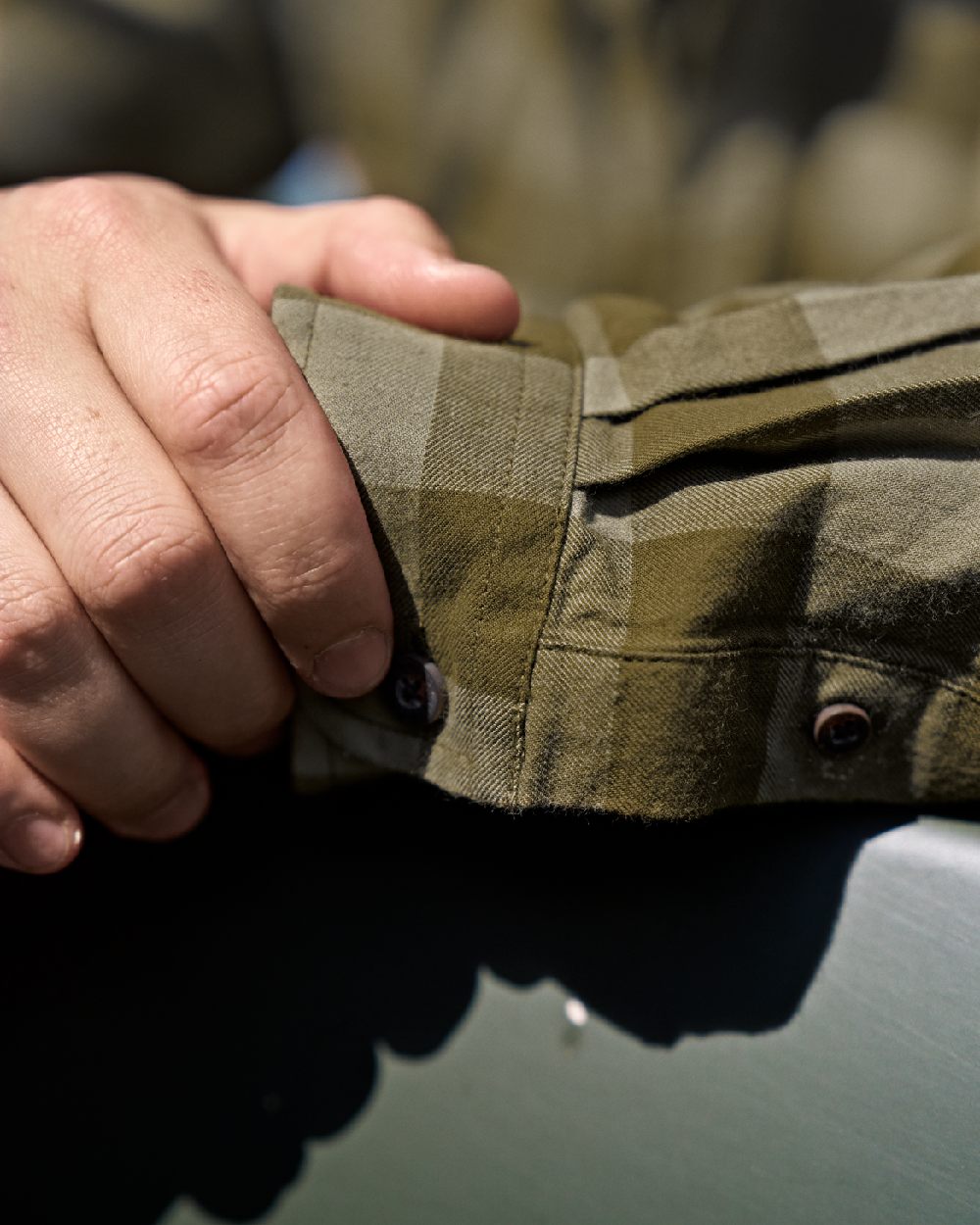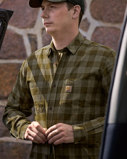 Dark Olive Check Coloured Harkila Scandinavian Long Sleeve Shirt on blurry background
