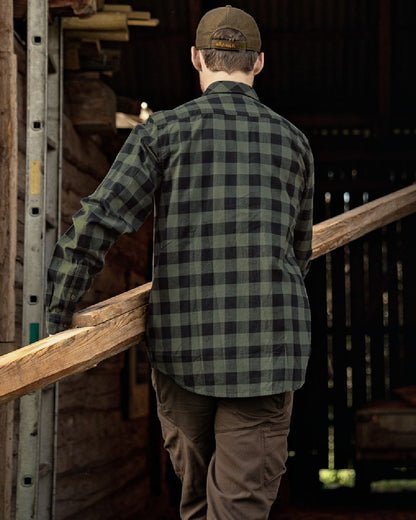 Green Check Coloured Harkila Scandinavian Long Sleeve Shirt on countryside background
