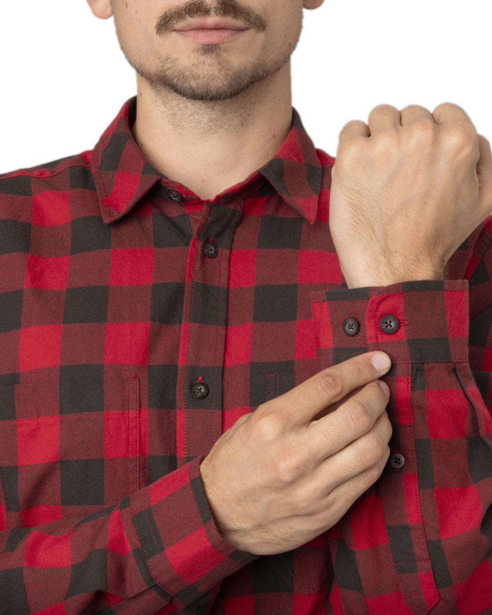 Red Check Coloured Harkila Scandinavian Long Sleeve Shirt on outdoor background