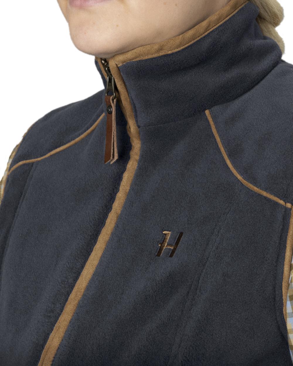 Dark Navy Coloured Harkila Womens Sandhem 200 Fleece Waistcoat on outdoor background