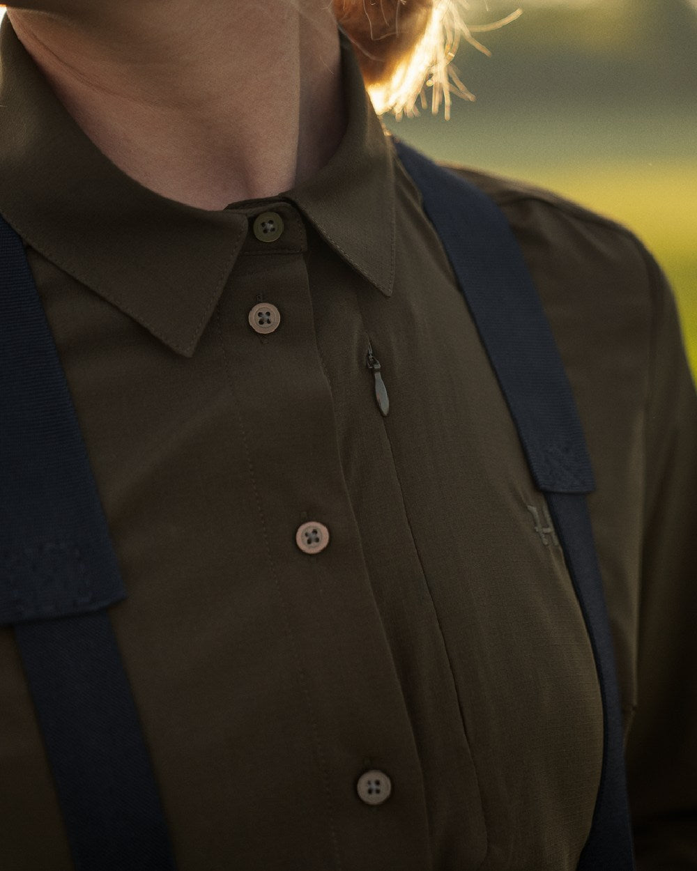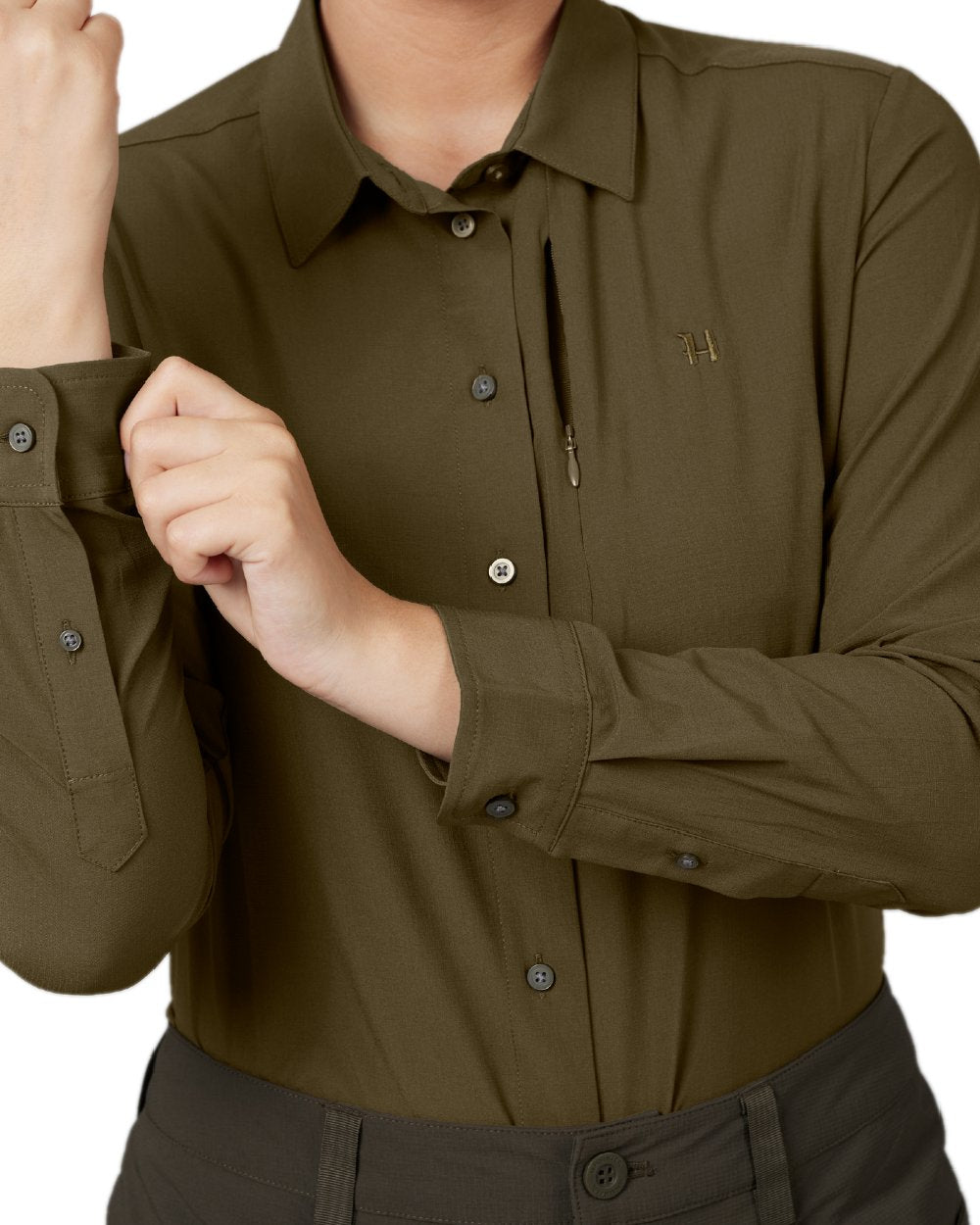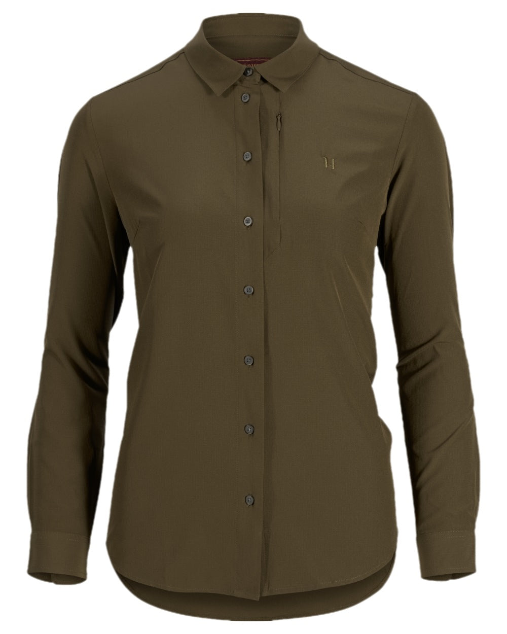 The Trail L/S Shirt has an active female cut and is finished off with underarm vents, a zipped chest pocket, button cuffs, and the trusty Harkila logo.