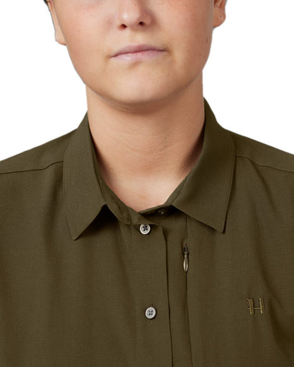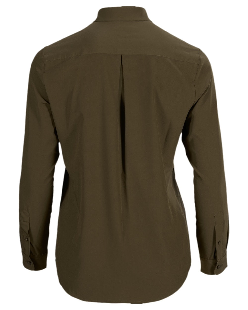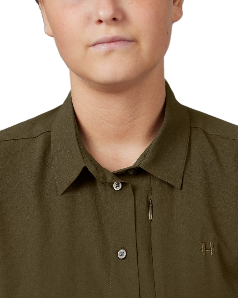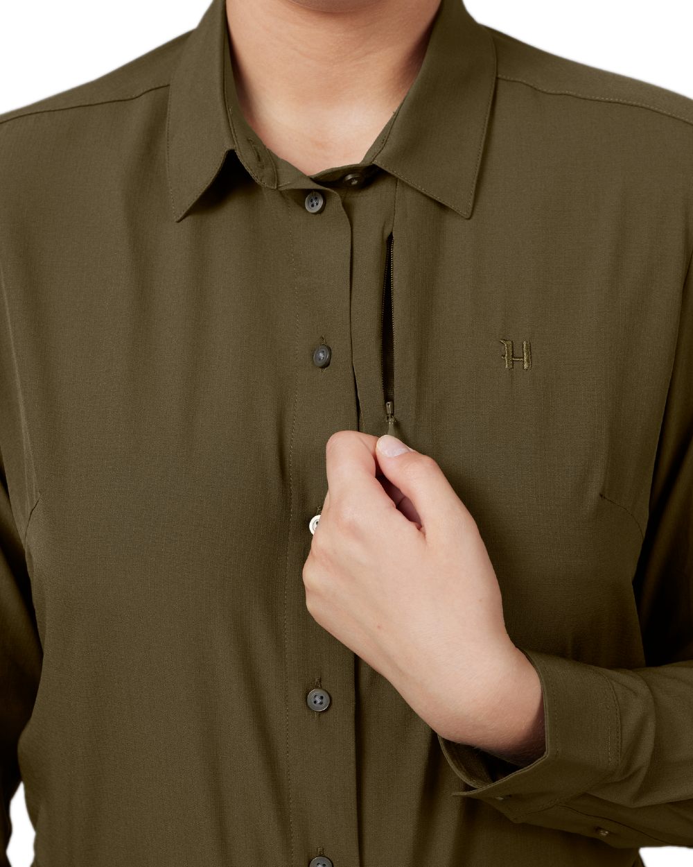 The Trail L/S Shirt has an active female cut and is finished off with underarm vents, a zipped chest pocket, button cuffs, and the trusty Harkila logo.