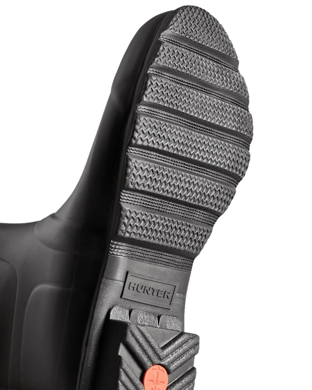 The Wide Fit Wellington Boot has been re-engineered for a wider fit. First debuted in 1956, our tall Wellington boots have been at the heart of the brand ever since. Now available with an updated and improved wide fit, these women’s wellington boots are handcrafted over three days from natural, vegan rubber, which is vulcanised for superior waterproof protection. With our signature Hunter tread underfoot, these black boots will protect you in wet and slippery conditions. We recommend that all Hunter boots be worn with socks to protect the wearer's skin from contact with rubber. All Hunter Boot Socks are specially designed for use with our boot range and feature a fold-over top to cover the rubber and nylon boot edge, preventing any rubbing associated with wear.