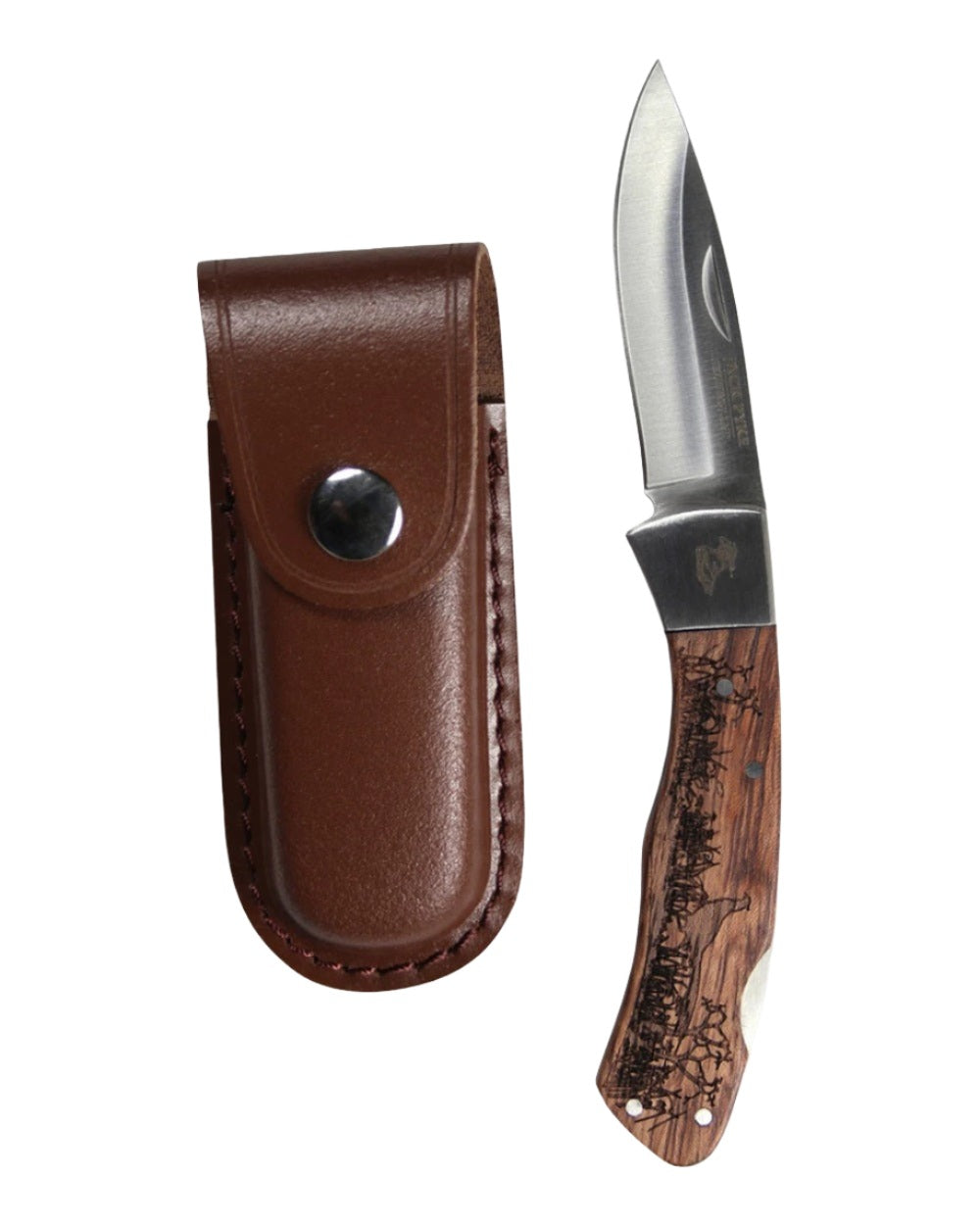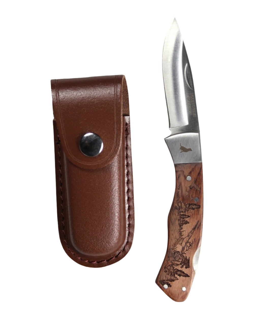 Jack Pyke Shires Knife Range includes stainless steel blade knives with rosewood handles featuring laser-etched country scenes on the bolster, including hunter, fish, pheasant, and deer. Each knife comes with a brown leather sheath with a press stud closure.