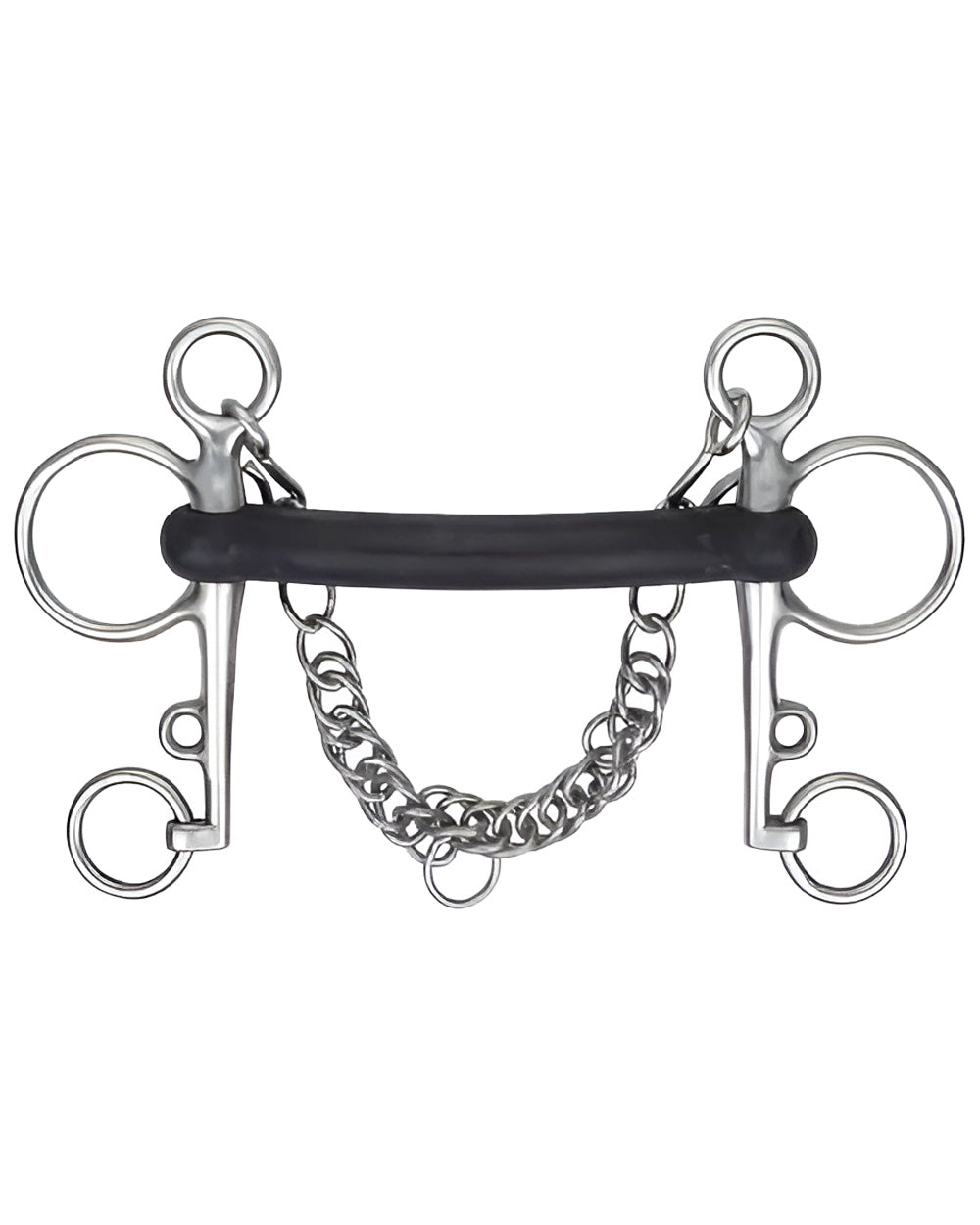 The Pelham bit combines the function of a snaffle and the action of a curb bit. The top rein provides snaffle pressure to the tongue and corners of the mouth, while the bottom rein increases leverage and curb chain pressure. The mouthpiece is slightly curved to accommodate the tongue and creates even pressure on the bars of the mouth and the horse's tongue. The thicker mouthpiece is softer on the corners and the bars of the mouth and pressure created by the reins is spread over a larger surface area. The hard rubber mouthpiece offers a warmer and softer option to stainless steel.