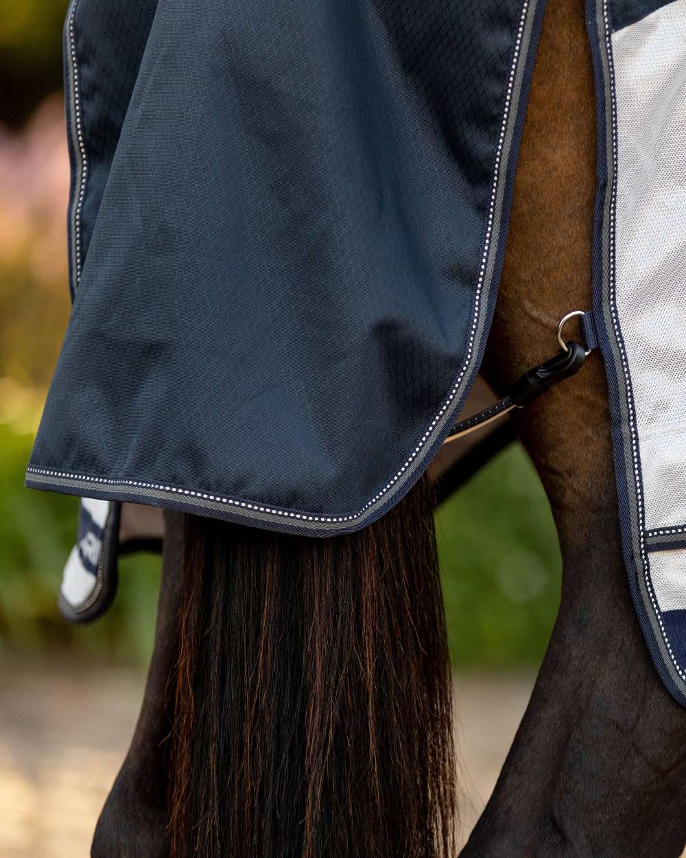 The extended, shaped belly flap maximizes coverage and features a three-strap closure with a detachable central strap. Our patented two-part skirt creates a break in the hemline to relieve tension around your horse's body, for unrestricted movement in the field.