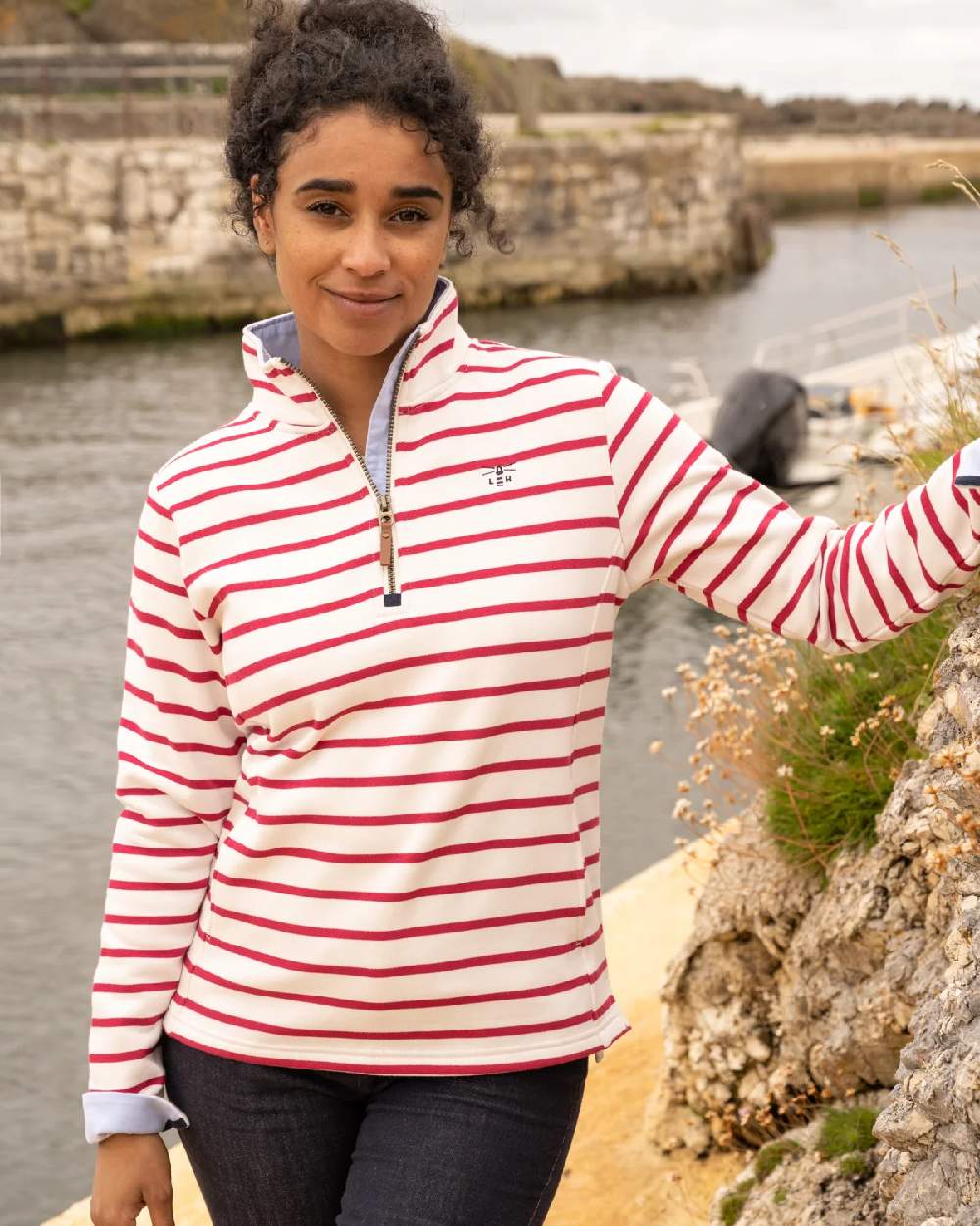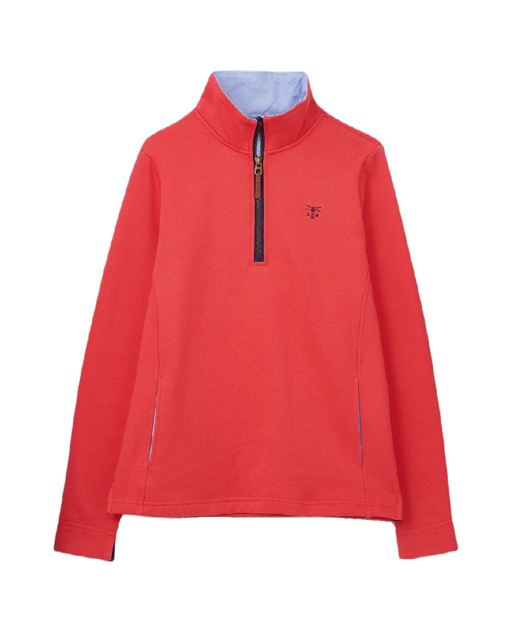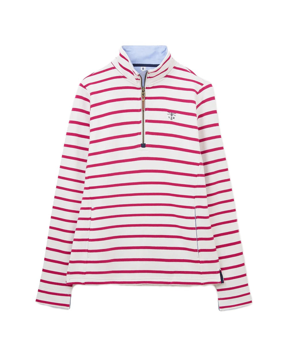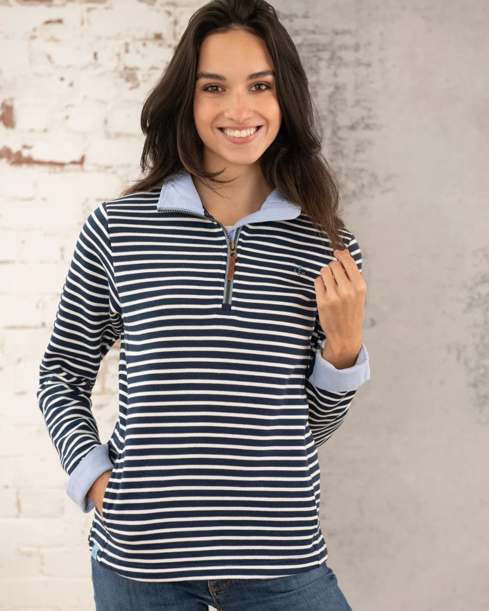 A smart half-zip funnel neck with a faux leather pull and heavy weight 100% cotton jersey give Shore a quality. Pockets set into shaped side seams give a streamlined and much more flattering cut than a standard sweatshirt. Finishing details such as the contrast chambray collar and optional cuff turn-back will effortlessly take this top from a walk on the beach to a casual dinner in a cosy seaside bistro.