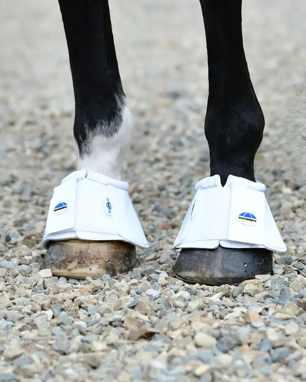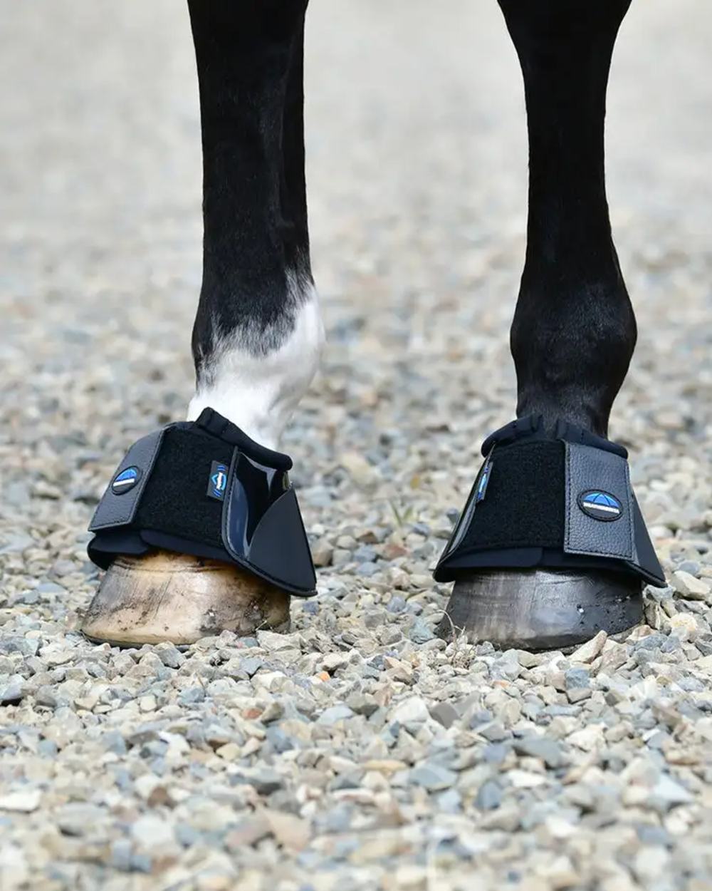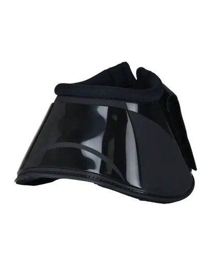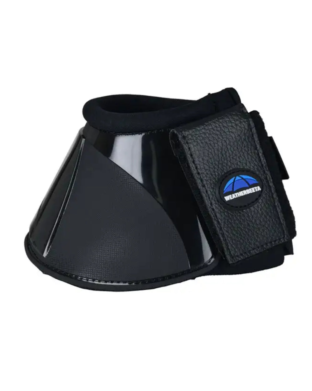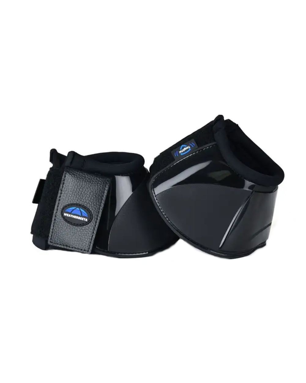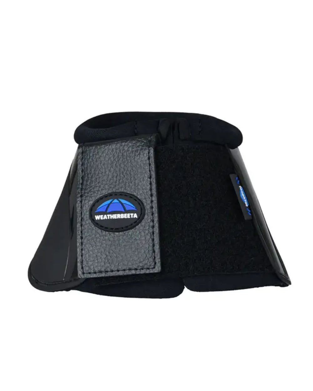 Black Coloured WeatherBeeta Tough-Tec Impact Bell Boots on horse background