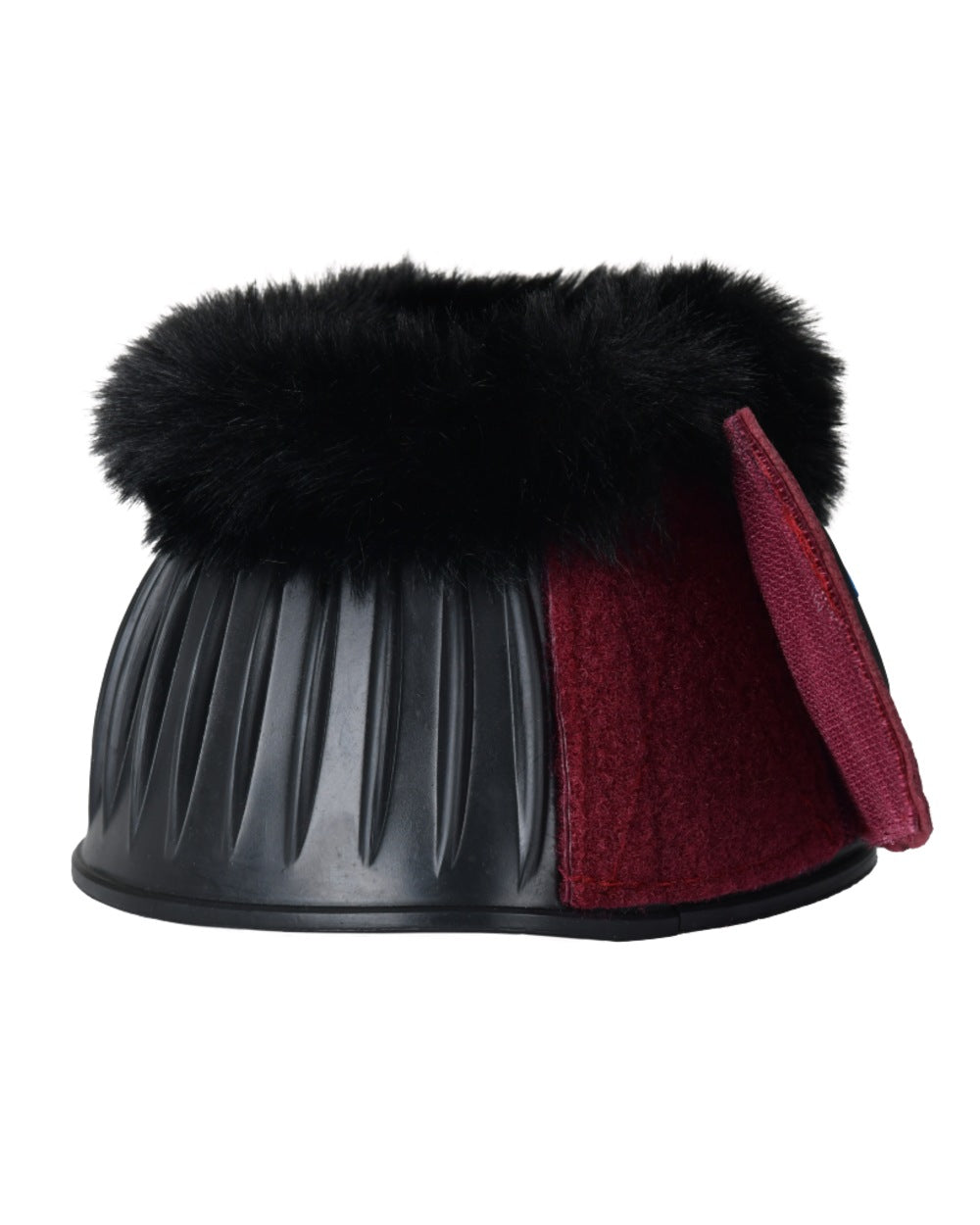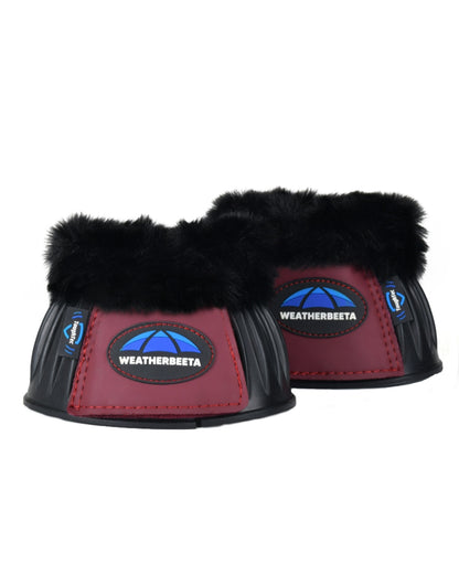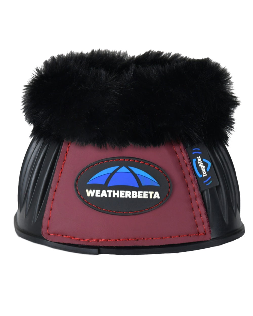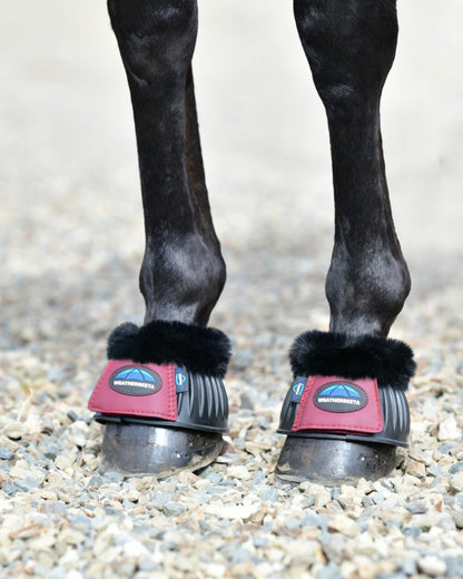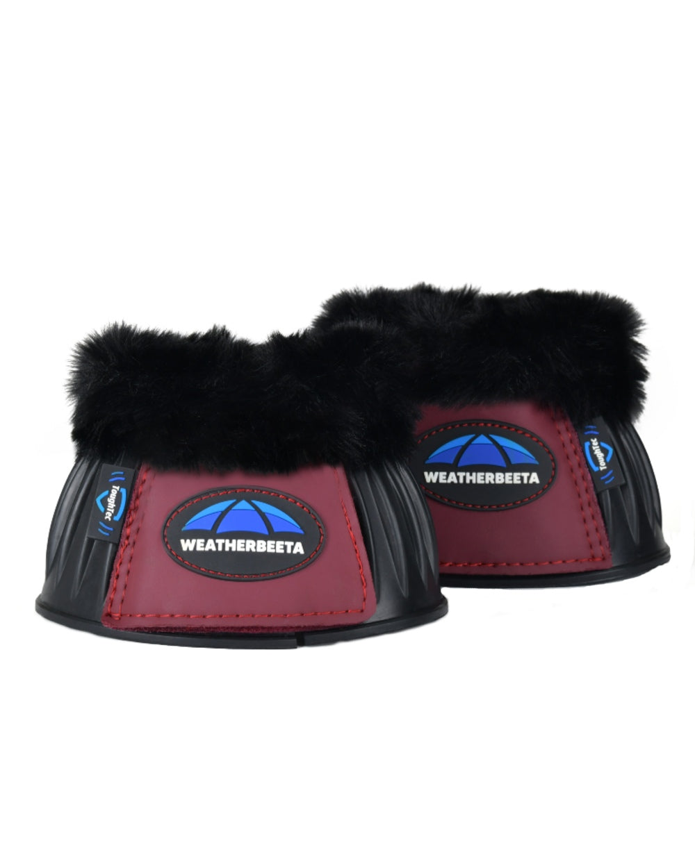 Black Burgundy Coloured WeatherBeeta Tough-Tec Prime Fleece Trim Rubber Bell Boots on horse background