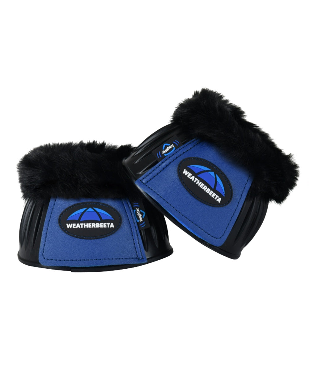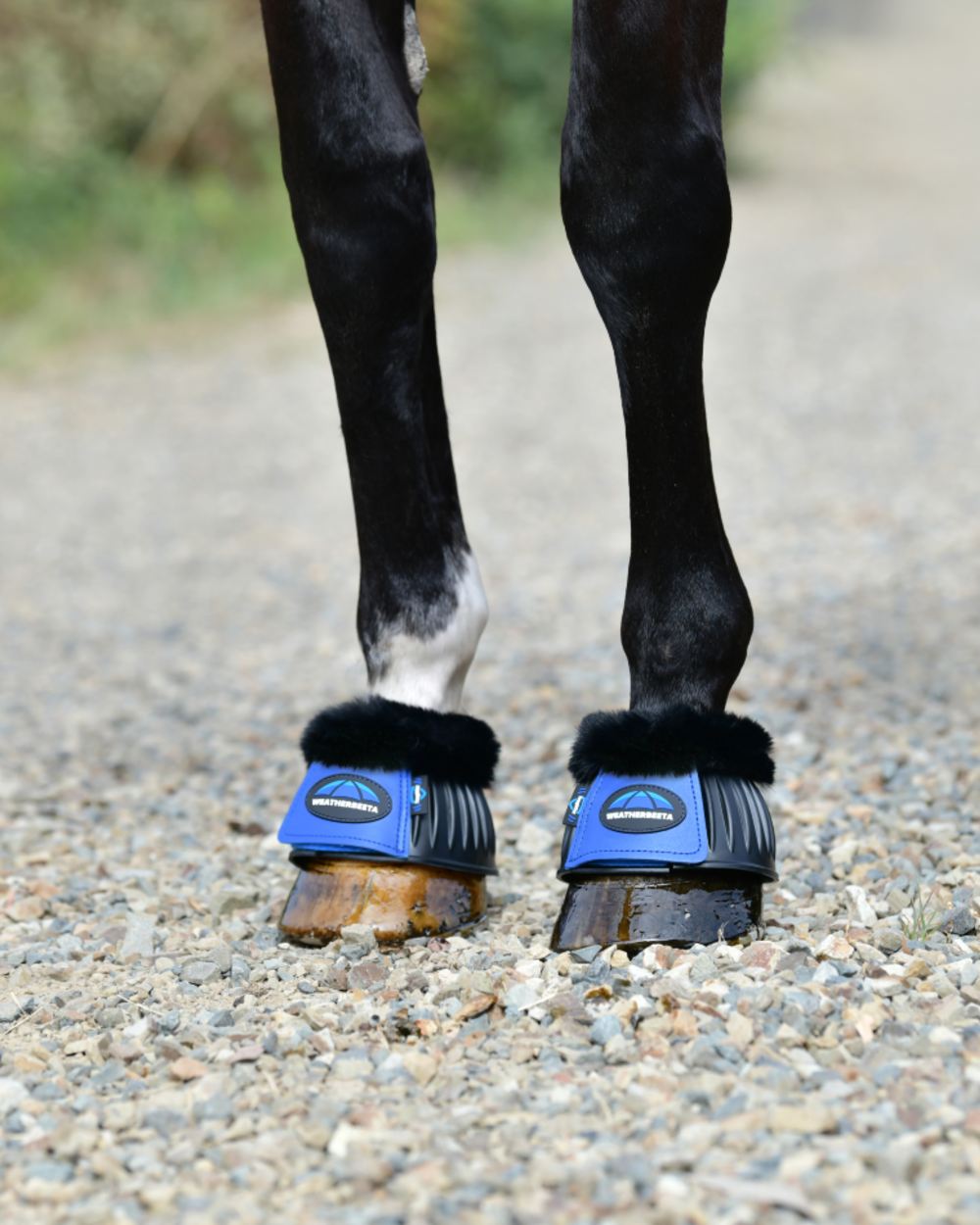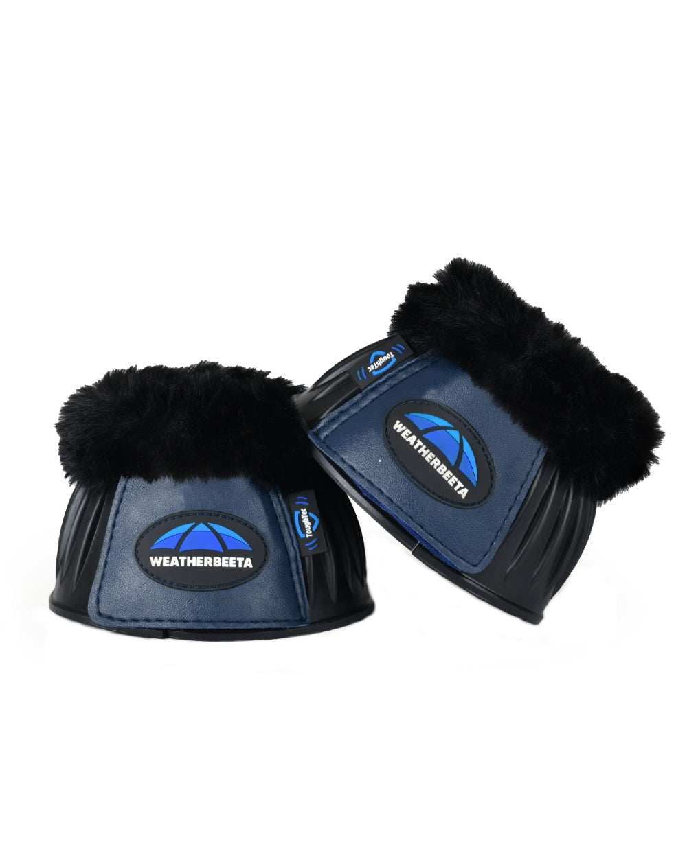Black Cobalt Coloured WeatherBeeta Tough-Tec Prime Fleece Trim Rubber Bell Boots on horse background