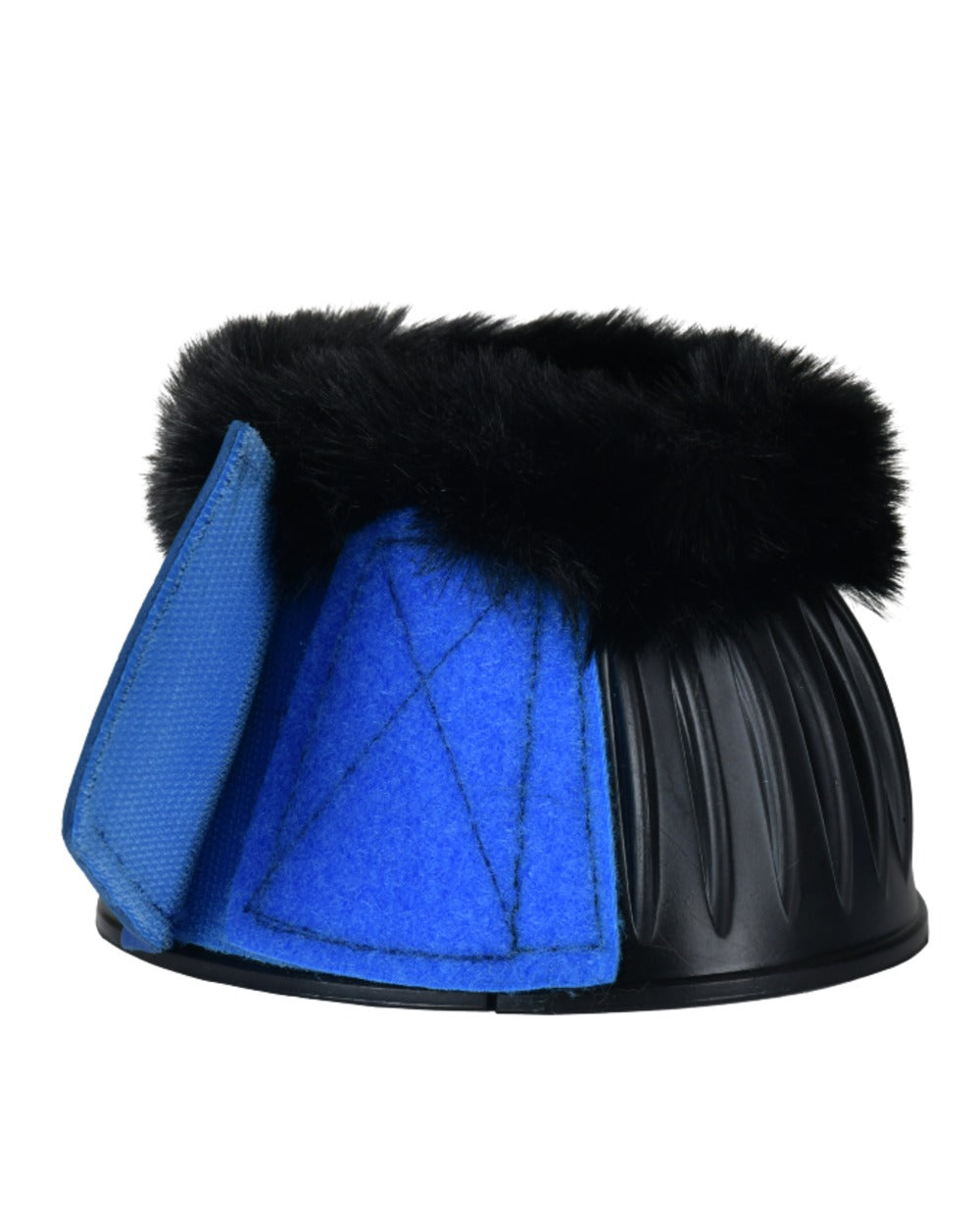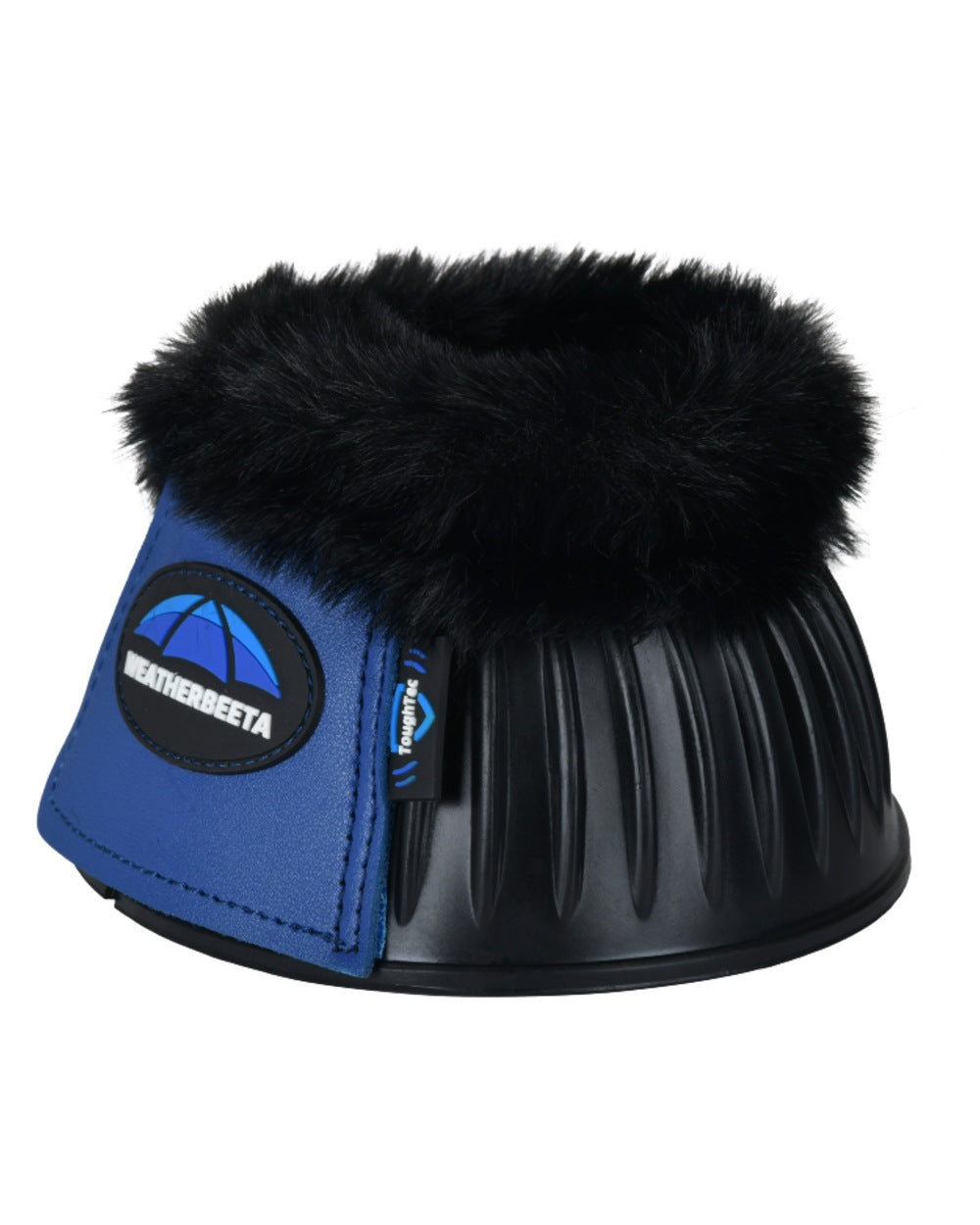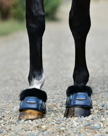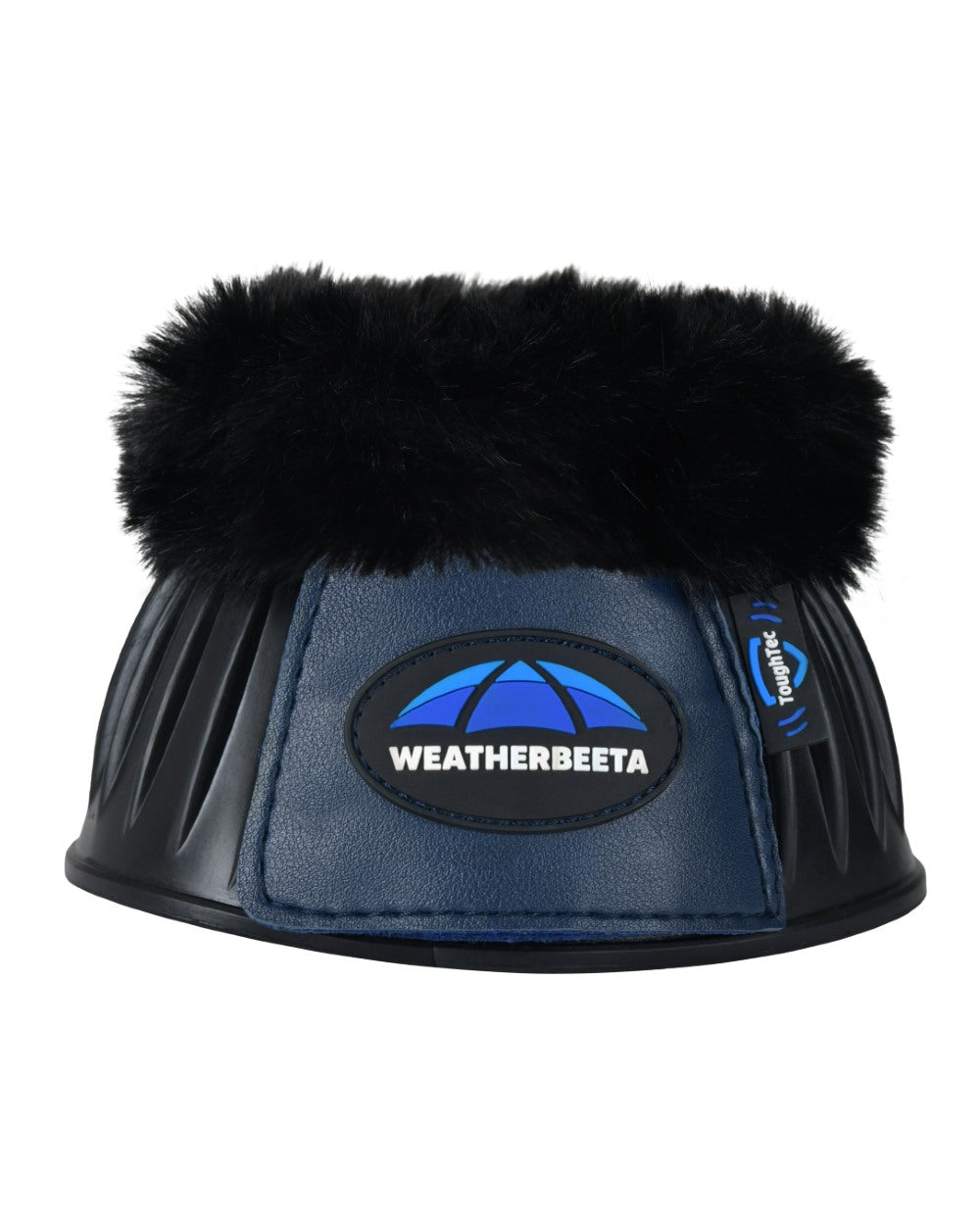 Black Cobalt Coloured WeatherBeeta Tough-Tec Prime Fleece Trim Rubber Bell Boots on horse background