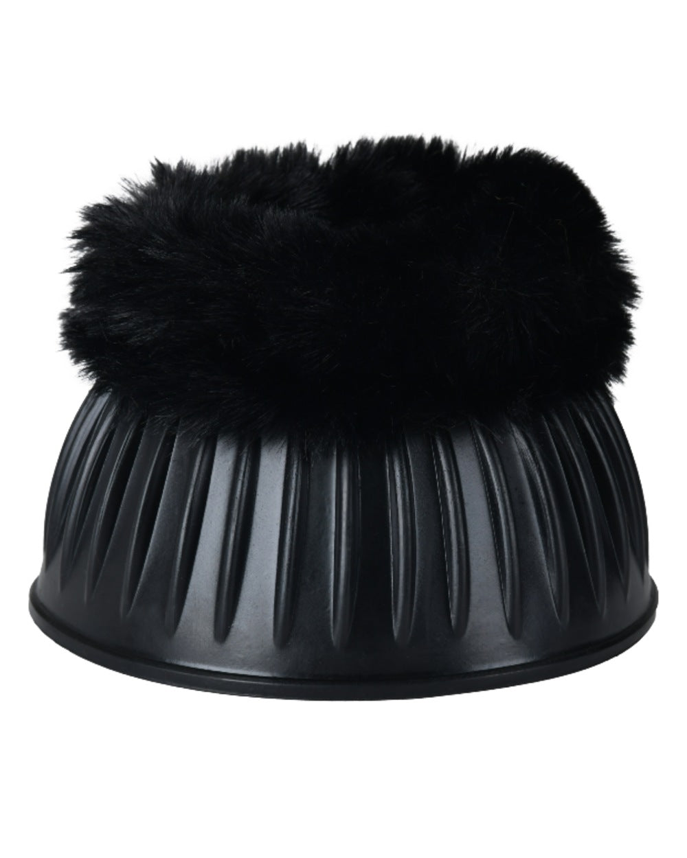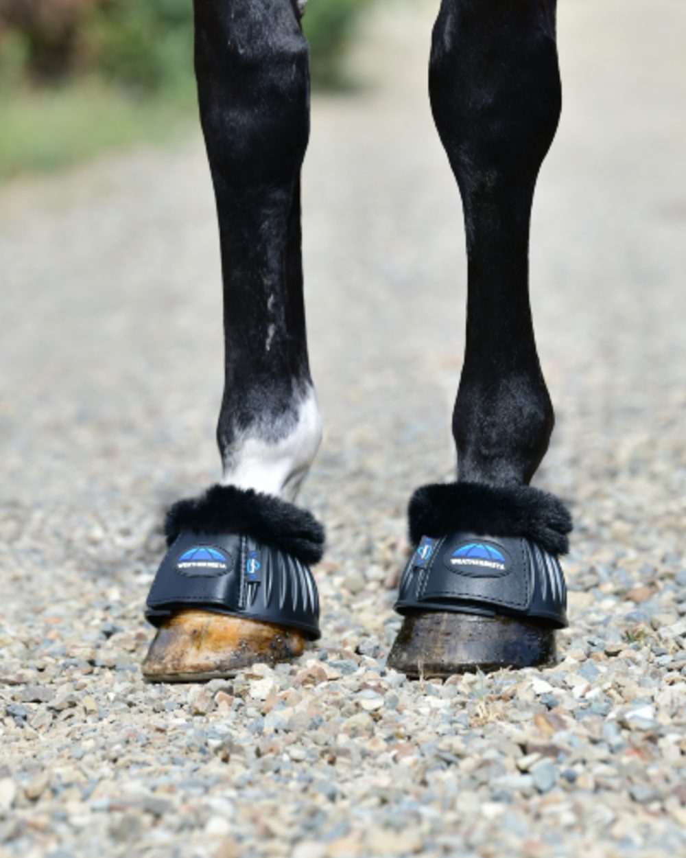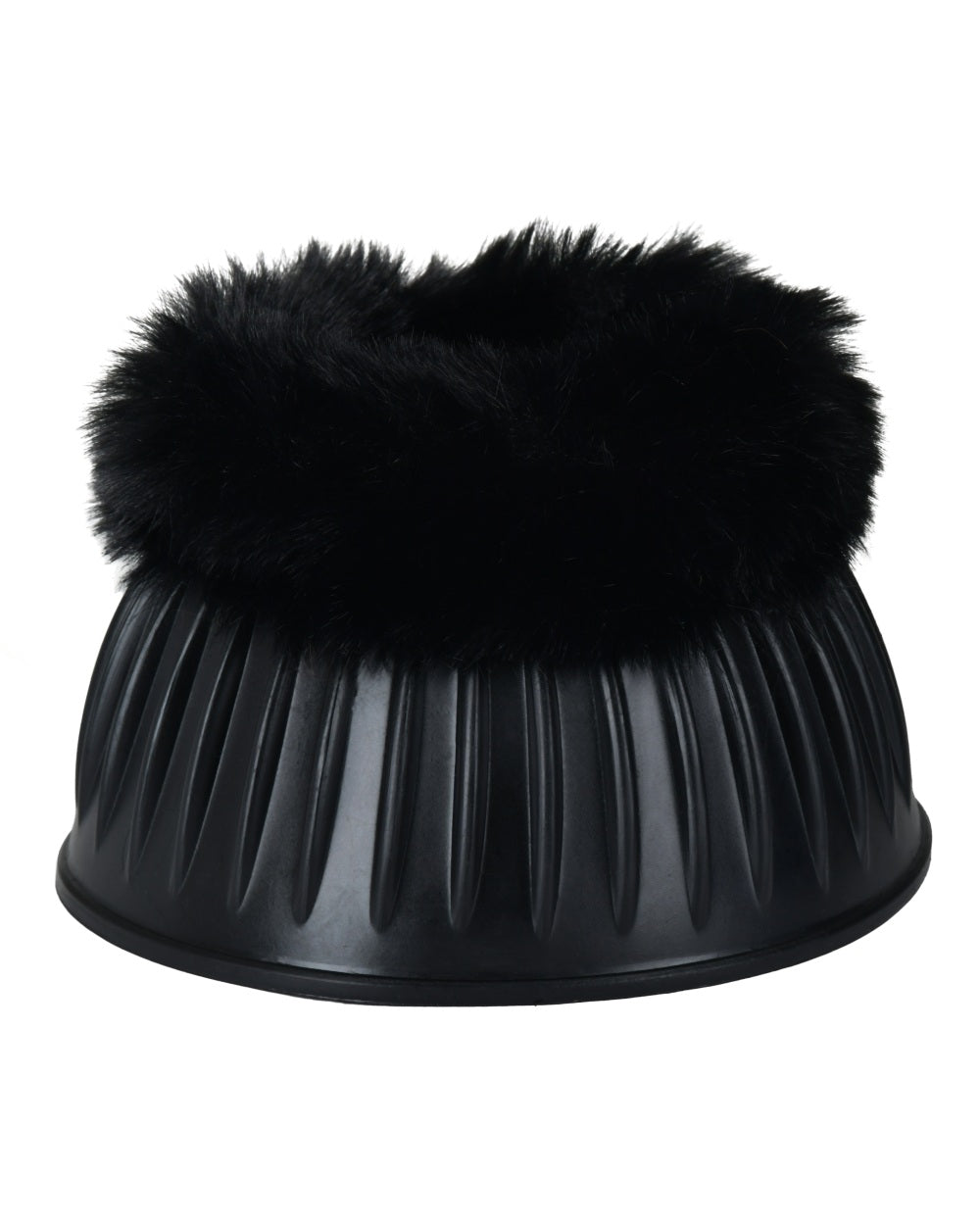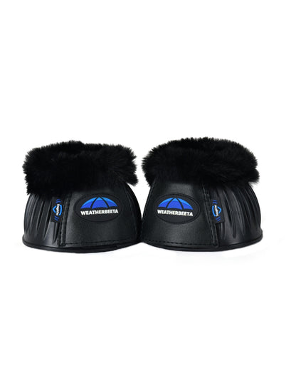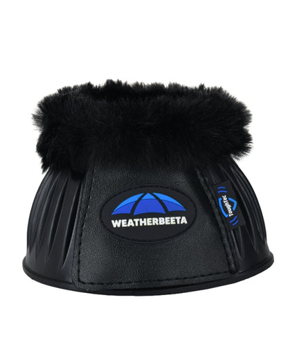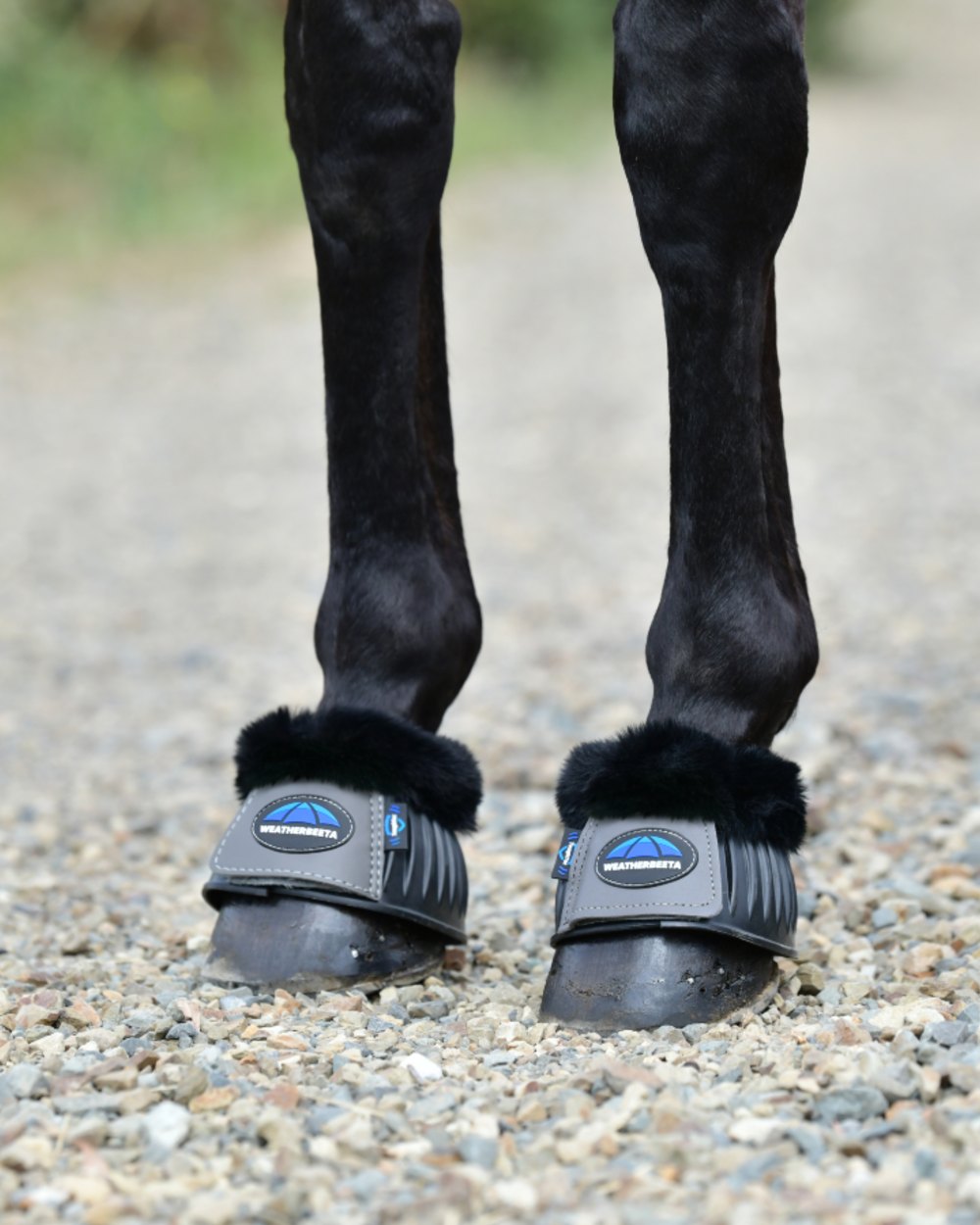 Black Coloured WeatherBeeta Tough-Tec Prime Fleece Trim Rubber Bell Boots on horse background