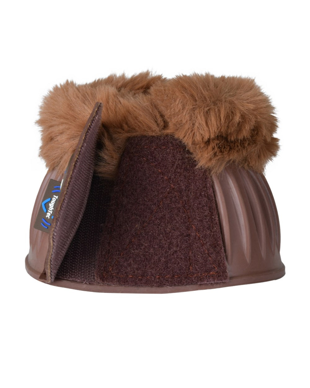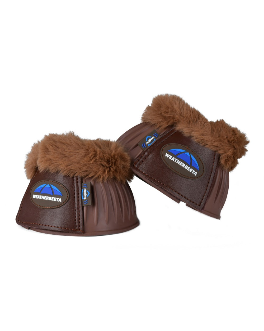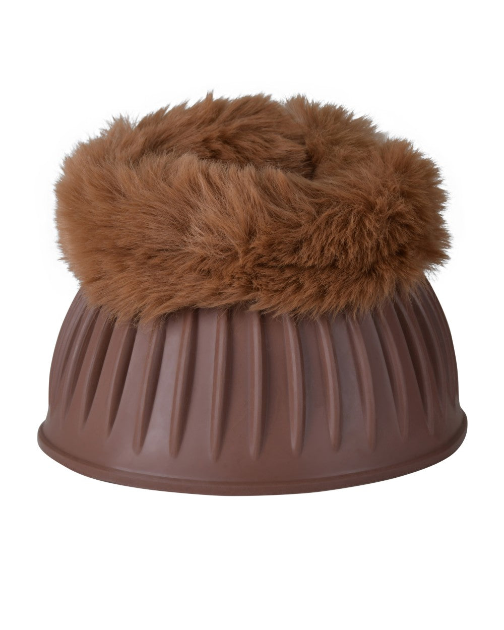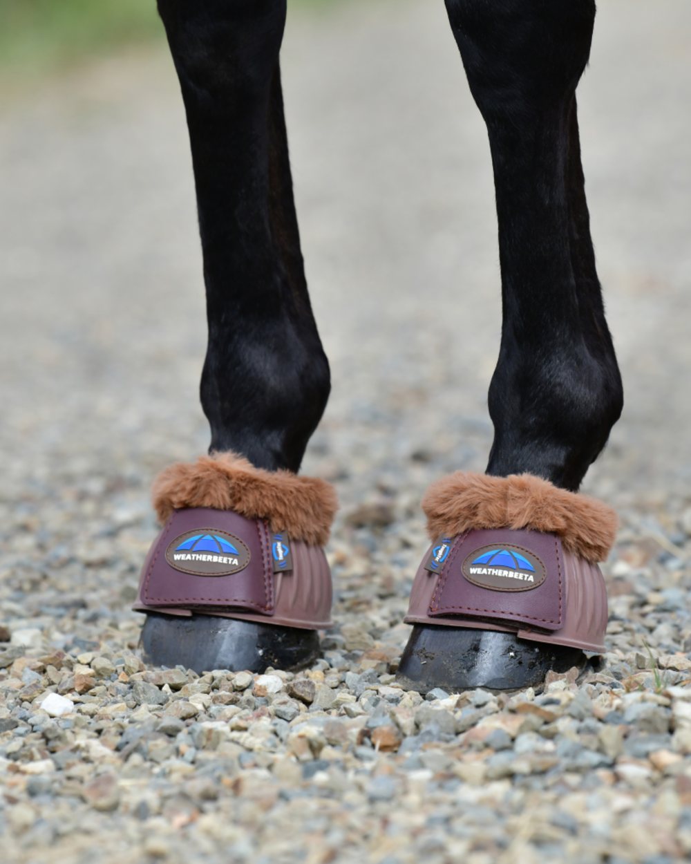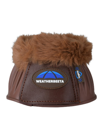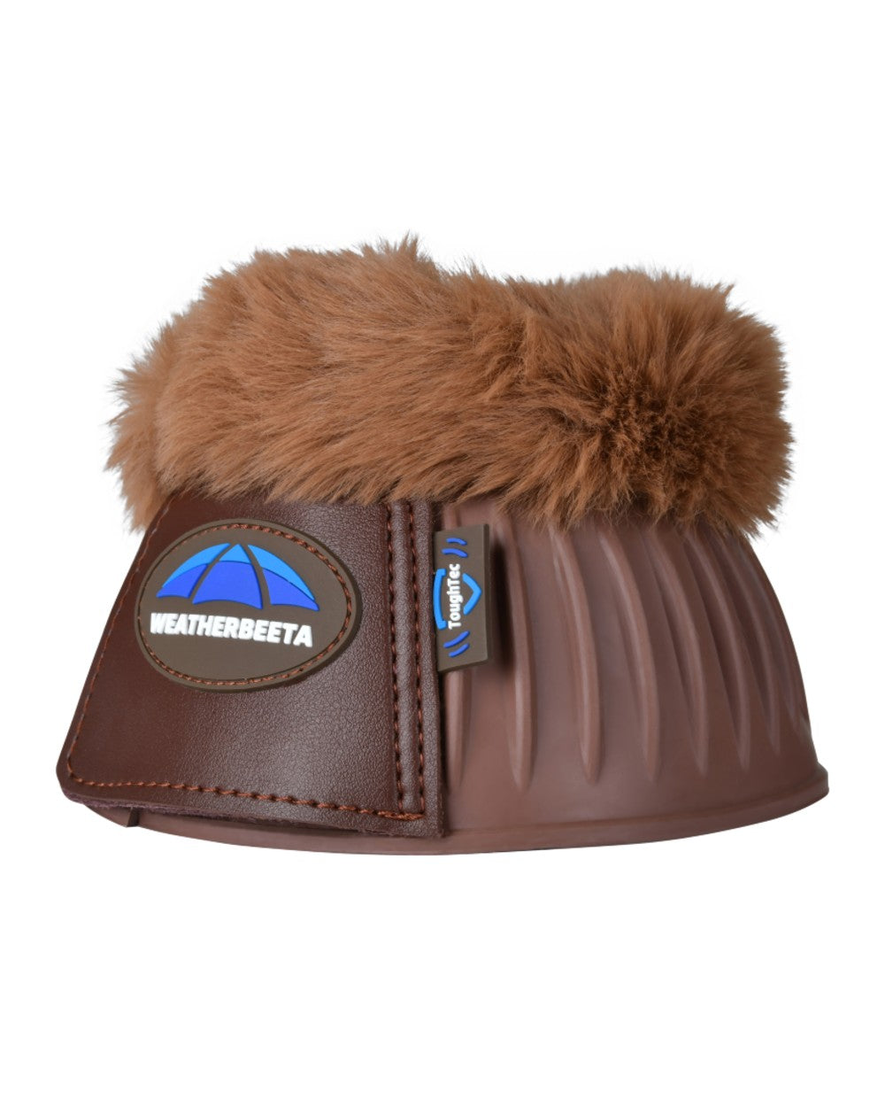 Brown Coloured WeatherBeeta Tough-Tec Prime Fleece Trim Rubber Bell Boots on horse background