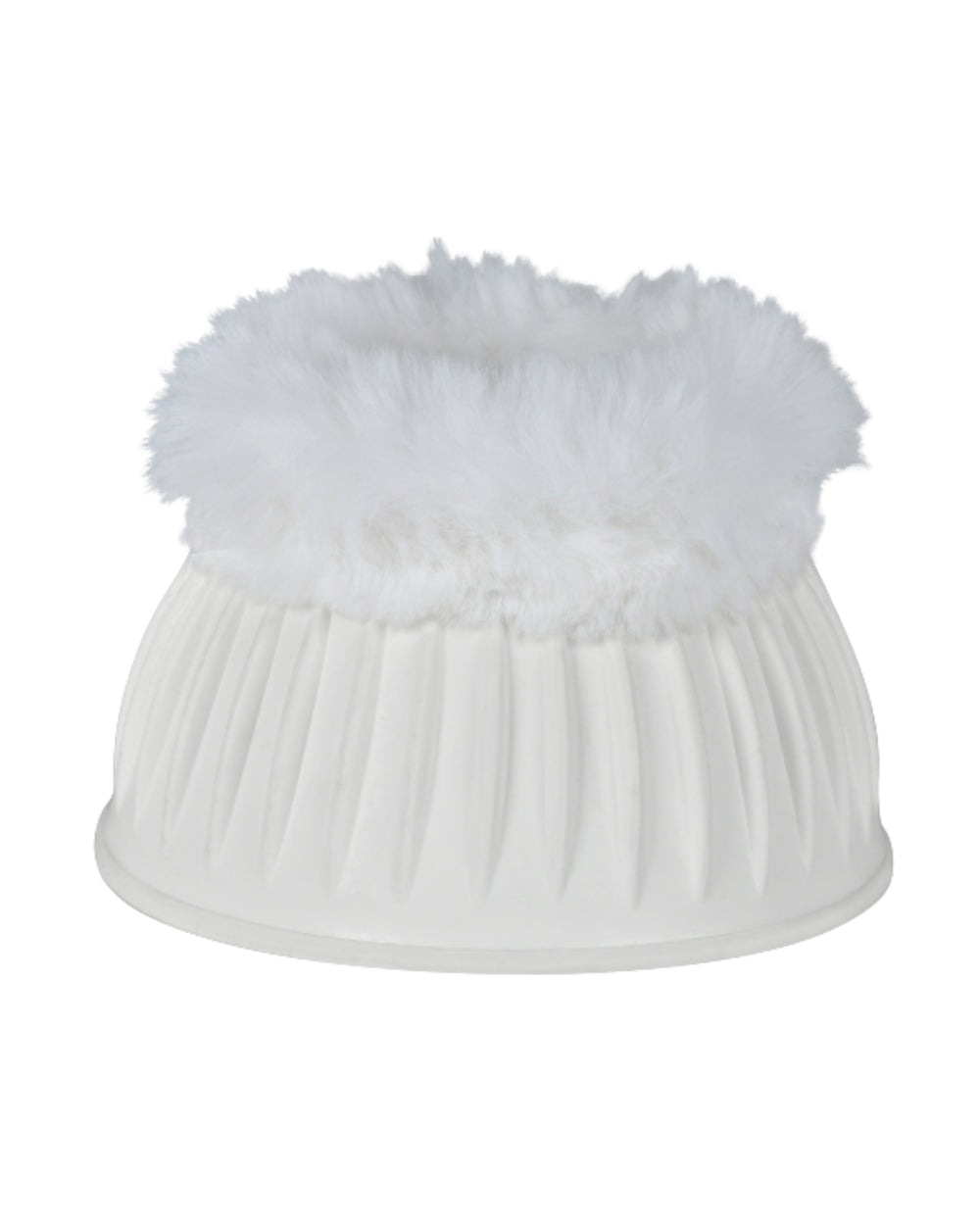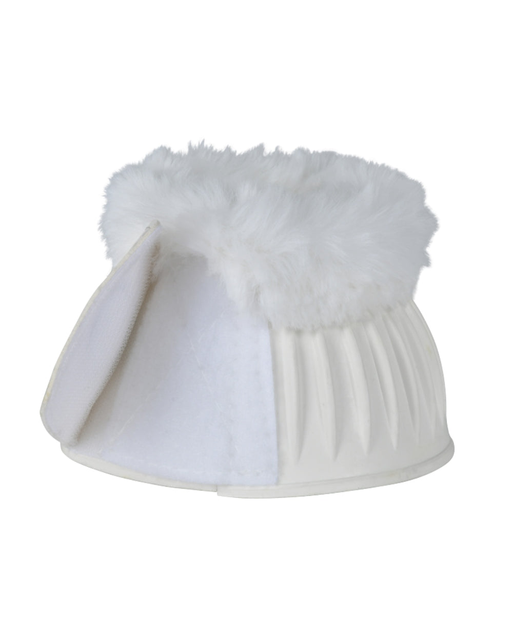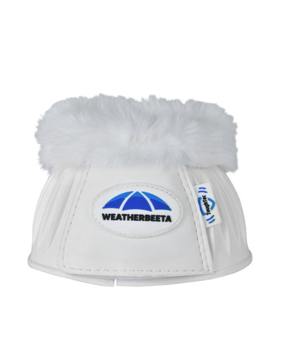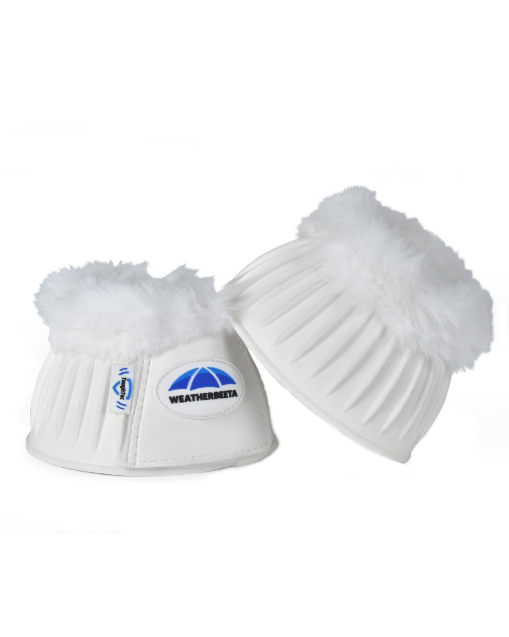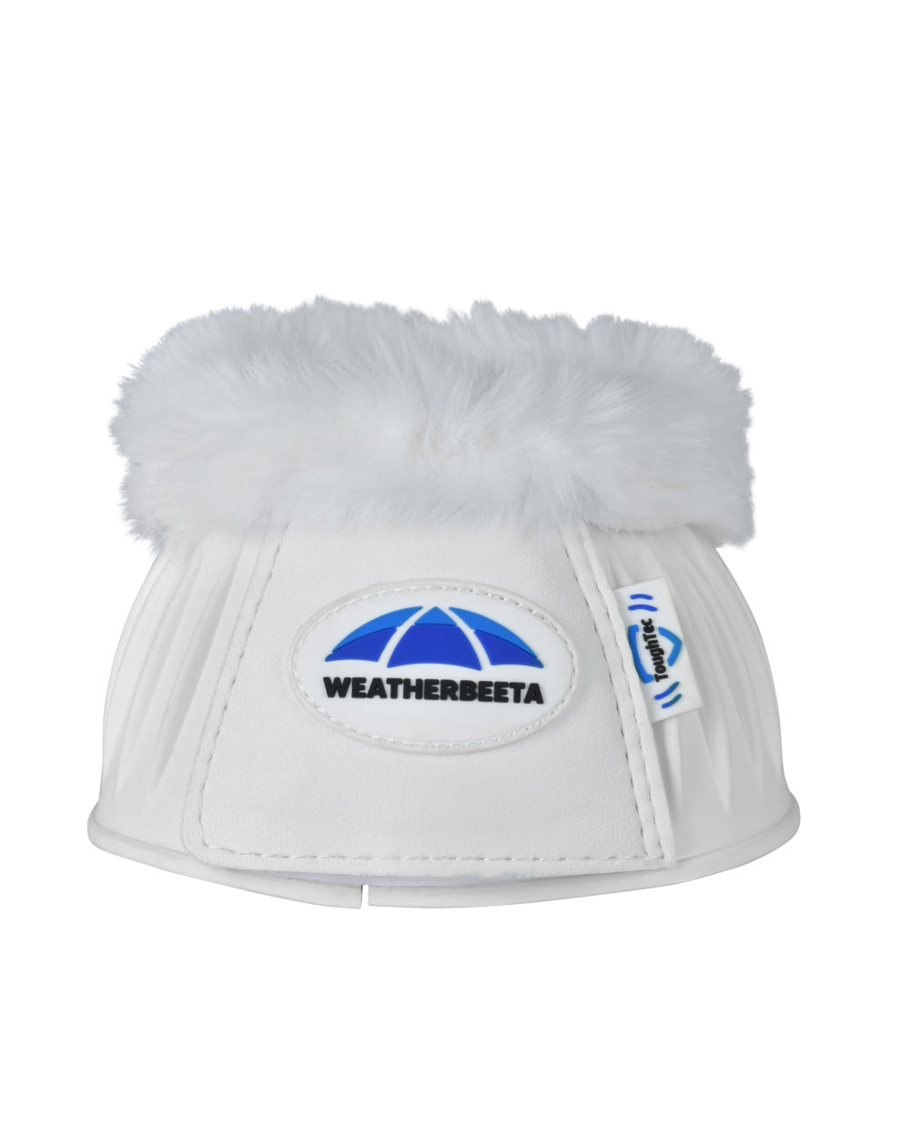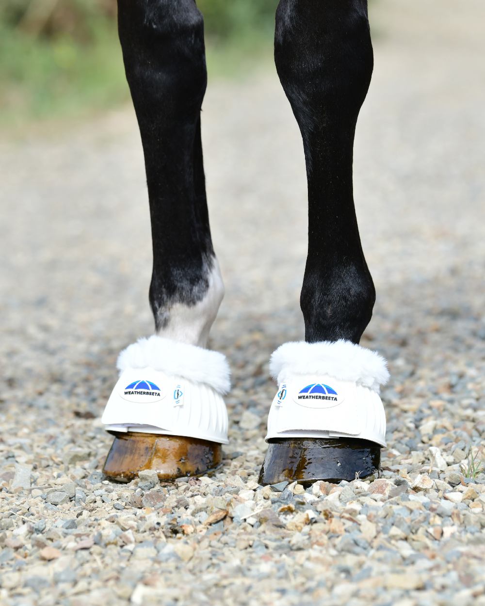 White Coloured WeatherBeeta Tough-Tec Prime Fleece Trim Rubber Bell Boots on horse background
